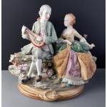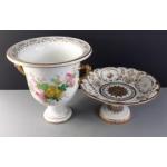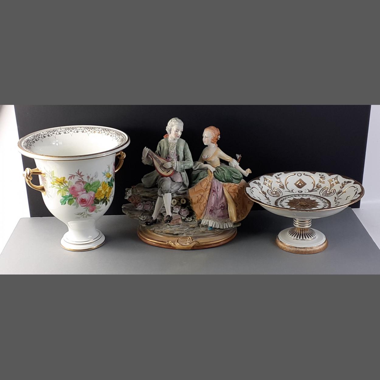 A ceramic collection to include a large DRESDEN marked figurine pair of a courting couple, 28cm high. Sold A/F as the end is broken off the Mandolin. Lot also icludes a large floral vase marked SEVRES to base standing 25cm high approx with slight rubbing to the gilt edging. Also a comport with blurred cross swords mark to base.