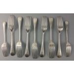 A set of nine silver forks comprising seven 20cm forks for Sheffield 1923. The smaller with matching Sheffield 1923 hallmarks. Total gross weight 548g approx