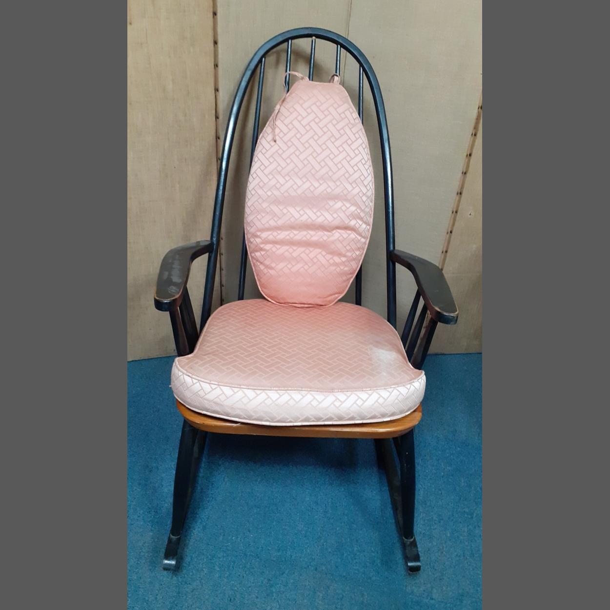 A very comfy black painted wooden rocking chair with salmon pink seat and back cushions measuring approx. L84cm x W60cm x H104cm. The black paint is slightly worn in areas and the cushions are slightly marked. A great upcycling project!