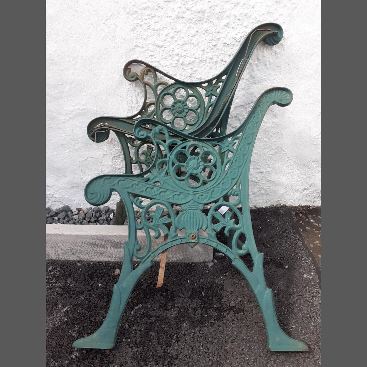 PERFECT for the GARDEN! Two green-painted cast metal wooden garden bench ends with centre strap. Measures approx. 71cm in height x 58cm in width. A great DIY project!