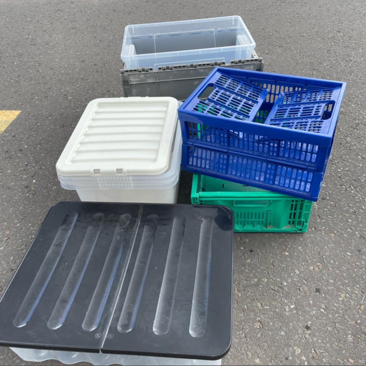 Plastic storage containers various sizes with a green and blue collapsible baskets etc