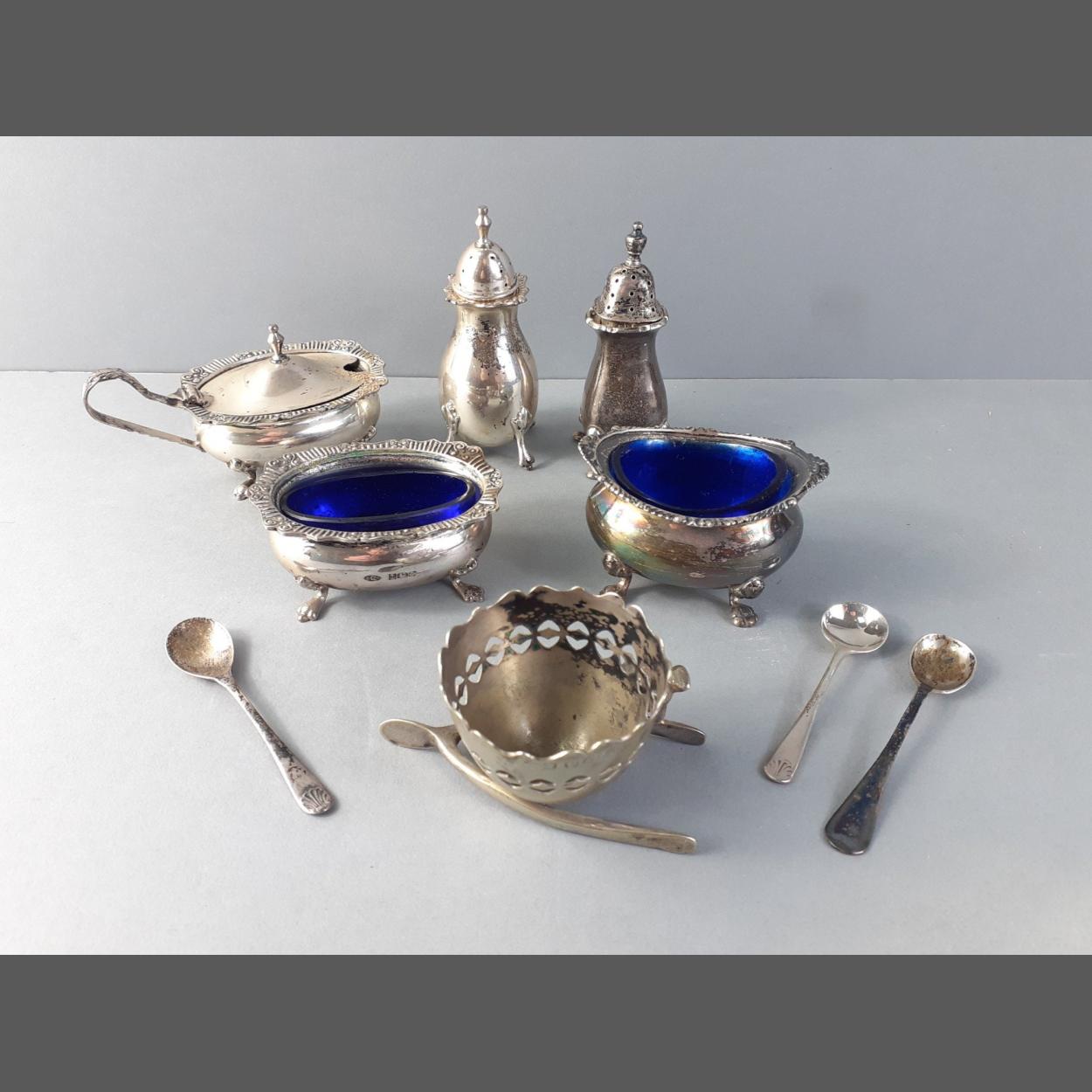 A small collection of silver hallmarked items including a mis-matched salt and pepper from London and Birmingham, 2 salts with Bristol blue liners and silver spoons and a small mustard pot with liner, weight (minus liners) 238g approx plus an unusual EPNS egg cup with wishbone base and small chick precariously perched