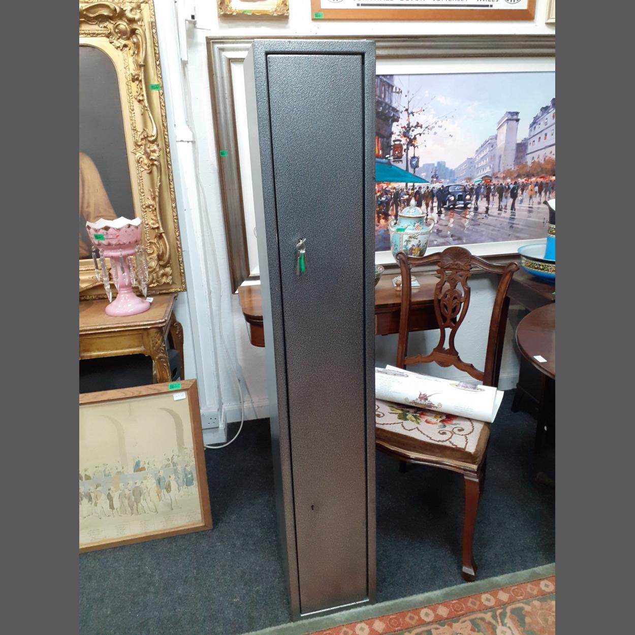 A gun cabinet/safe standing 150cm high approx, comes with a lockable ammo compartment and a shotgun cartridge belt inside with a pull-through cleaning kit and a full set of keys