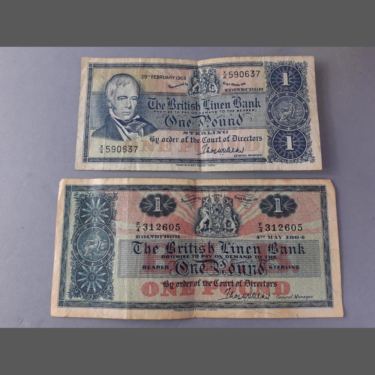 Two interesting Scottish bank notes from THE BRITISH LINEN BANK, one a 1964 one pound, and the other a 1968 one pound, both with wear.