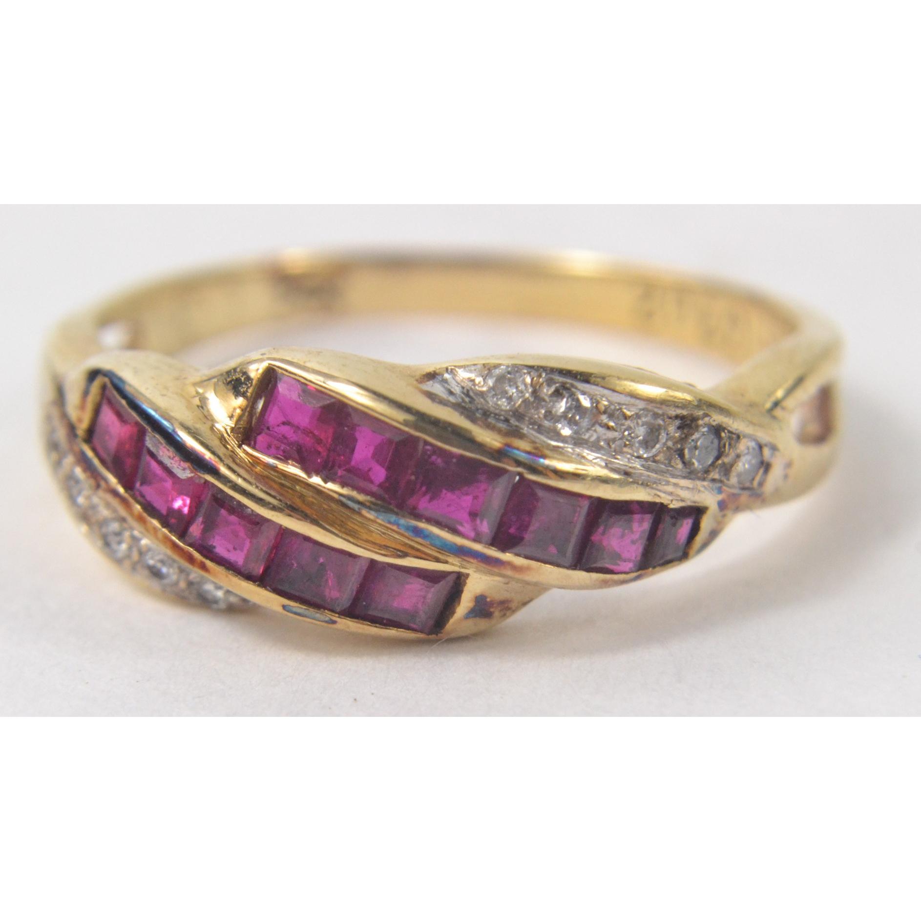 14k yellow gold ring set with bagette cut rubys with two lines of diamonds