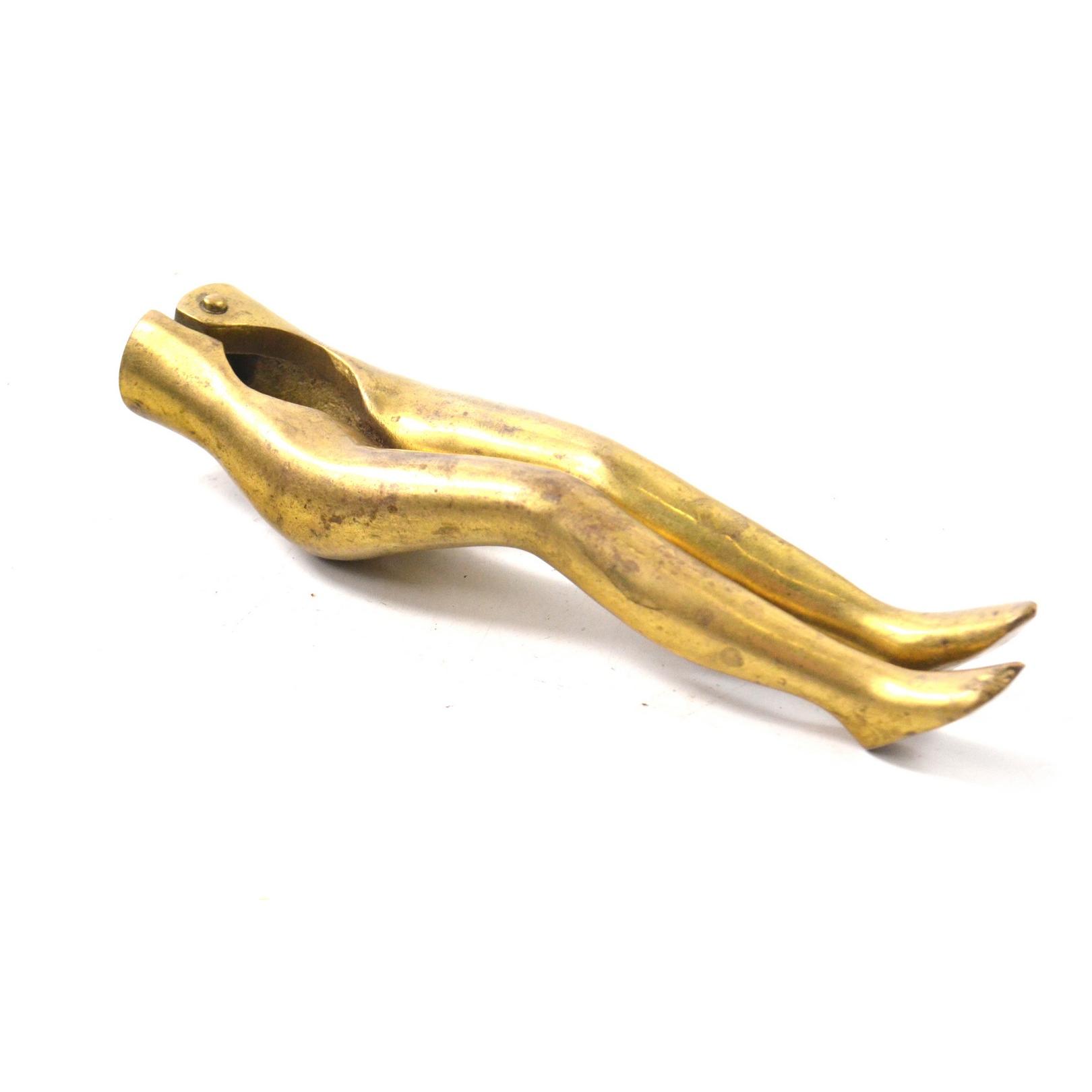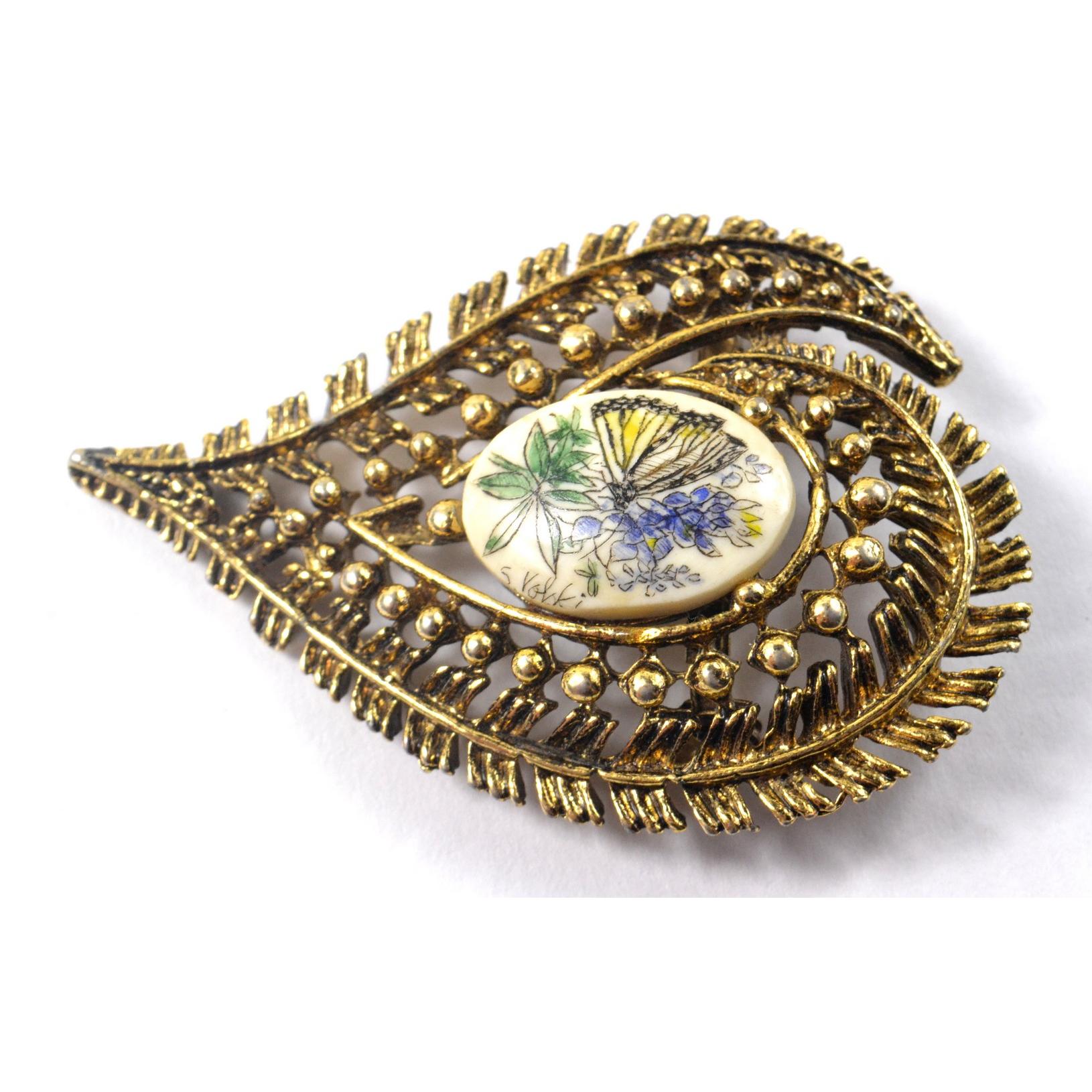 RARE Yellow metal leaf brooch with detailed scrimshaw center
