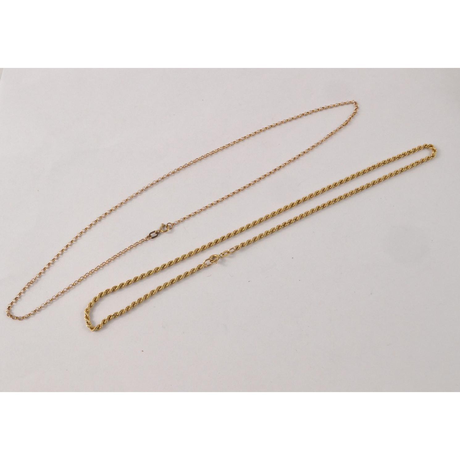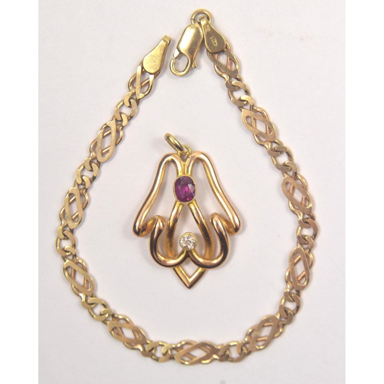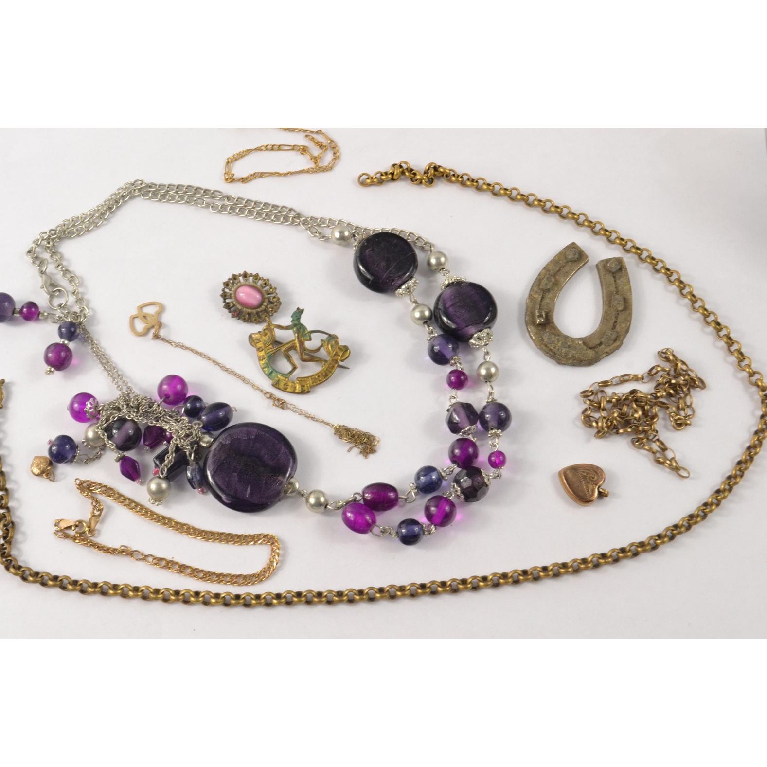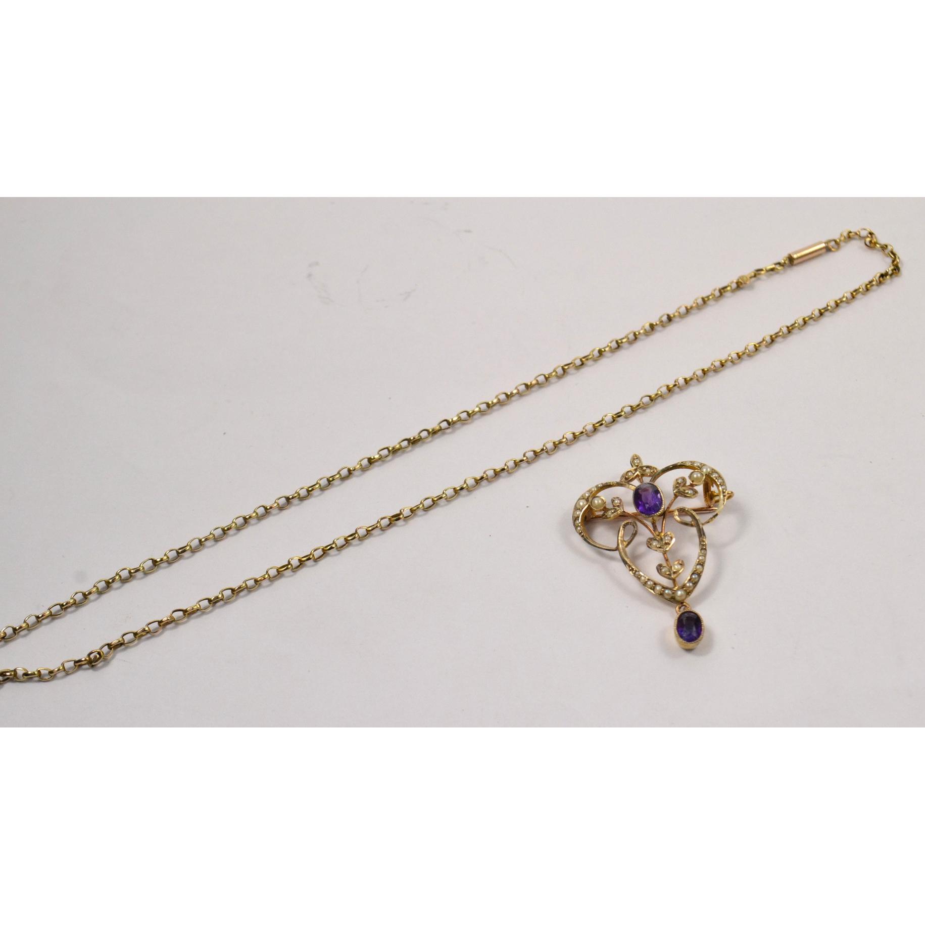 A stamped 9ct gold chain 40cm Length approx, 2.73g, with a 9ct vintage brooch with purple stone and seed pearl style gross weight 3.28g 4cm Length