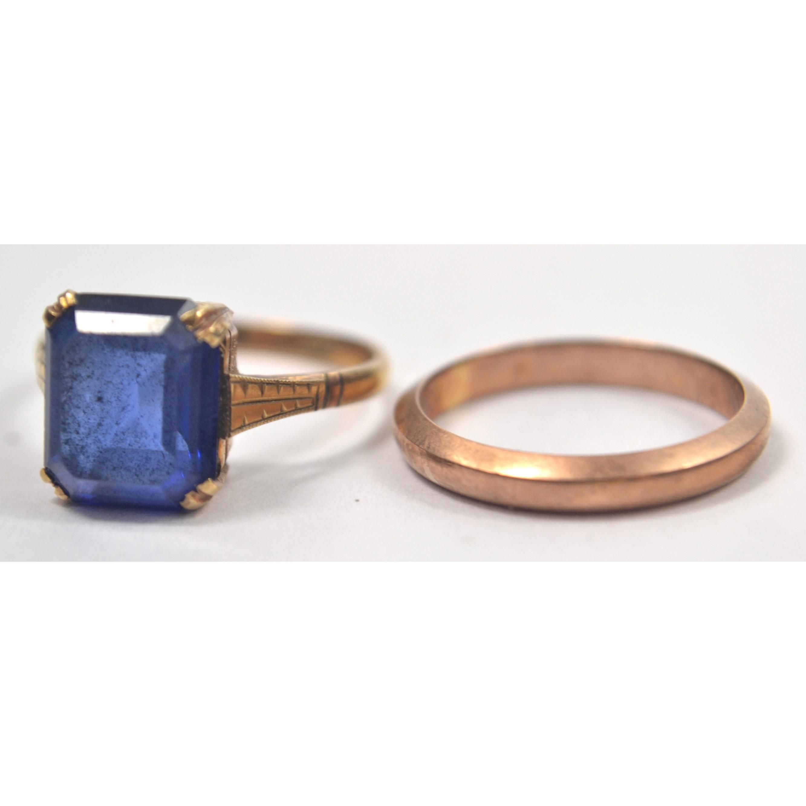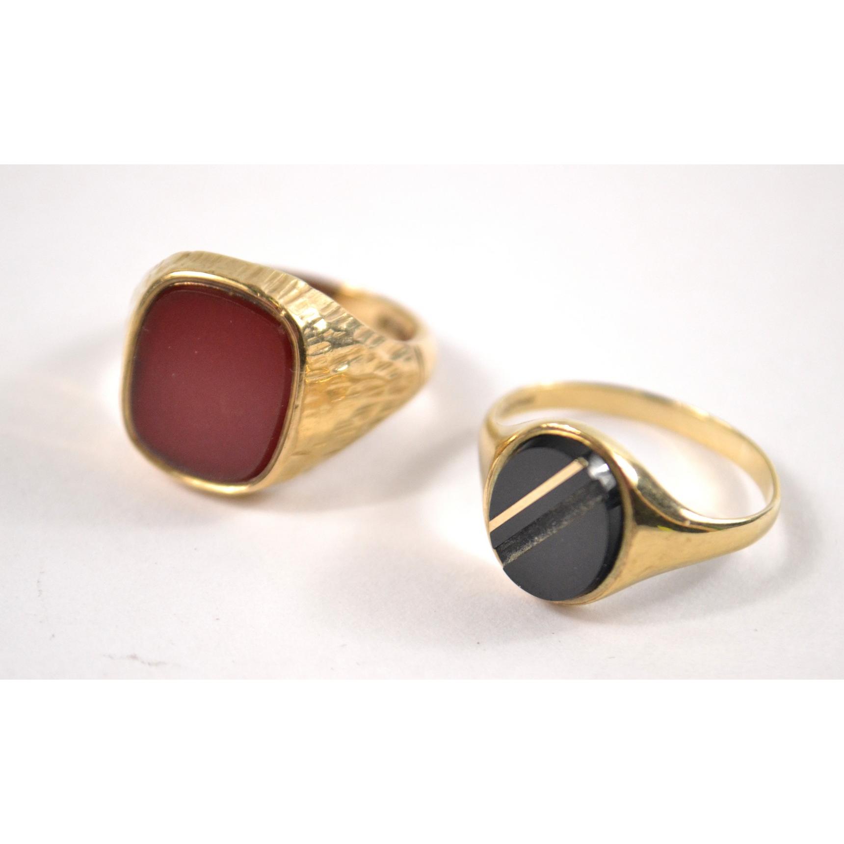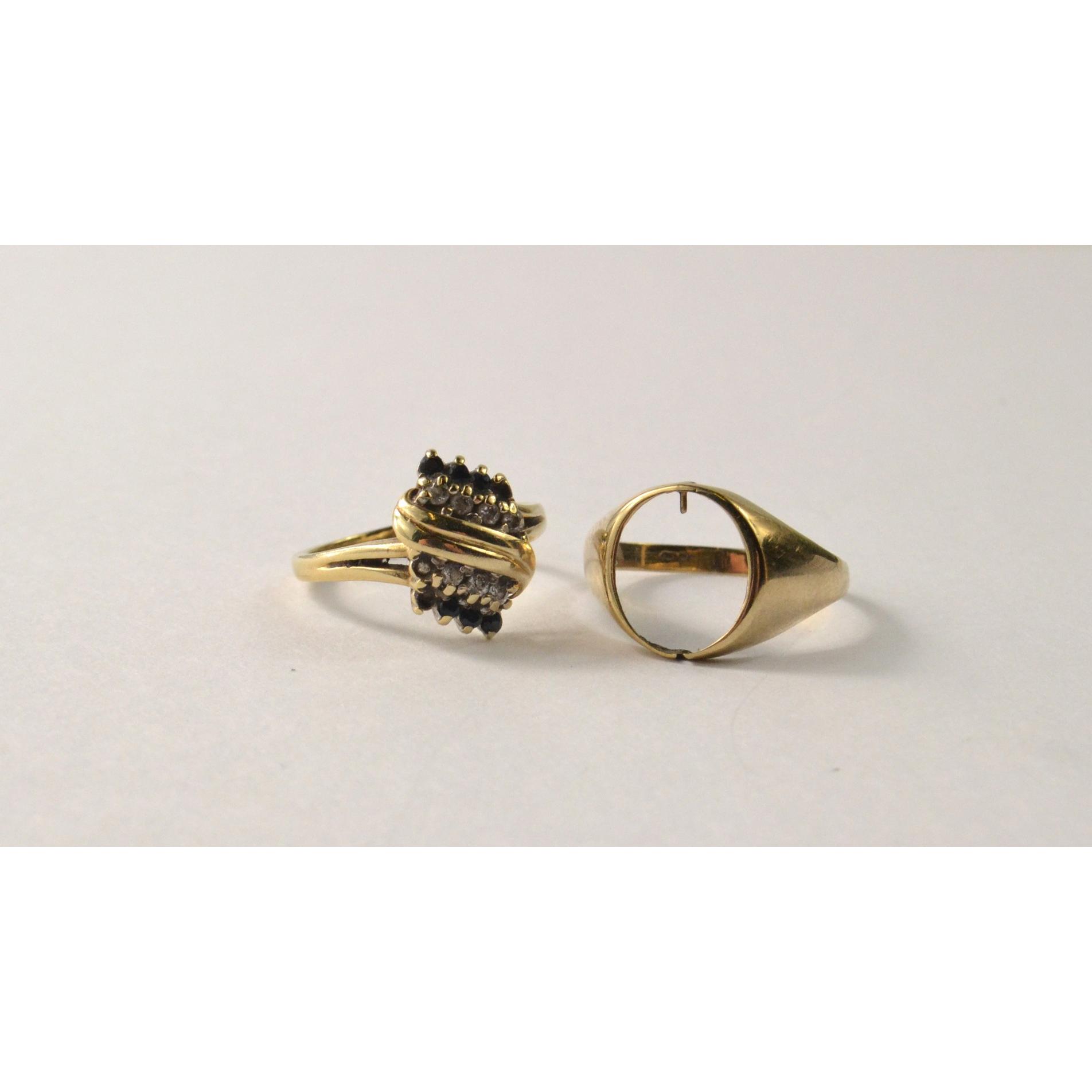 375 stamped gold gents signet ring missing it's stone 1.87g size Q, also a 375 stamped gold ladies dress ring with sapphires and clear stone, one diamond missing gross weight 3.21g size O