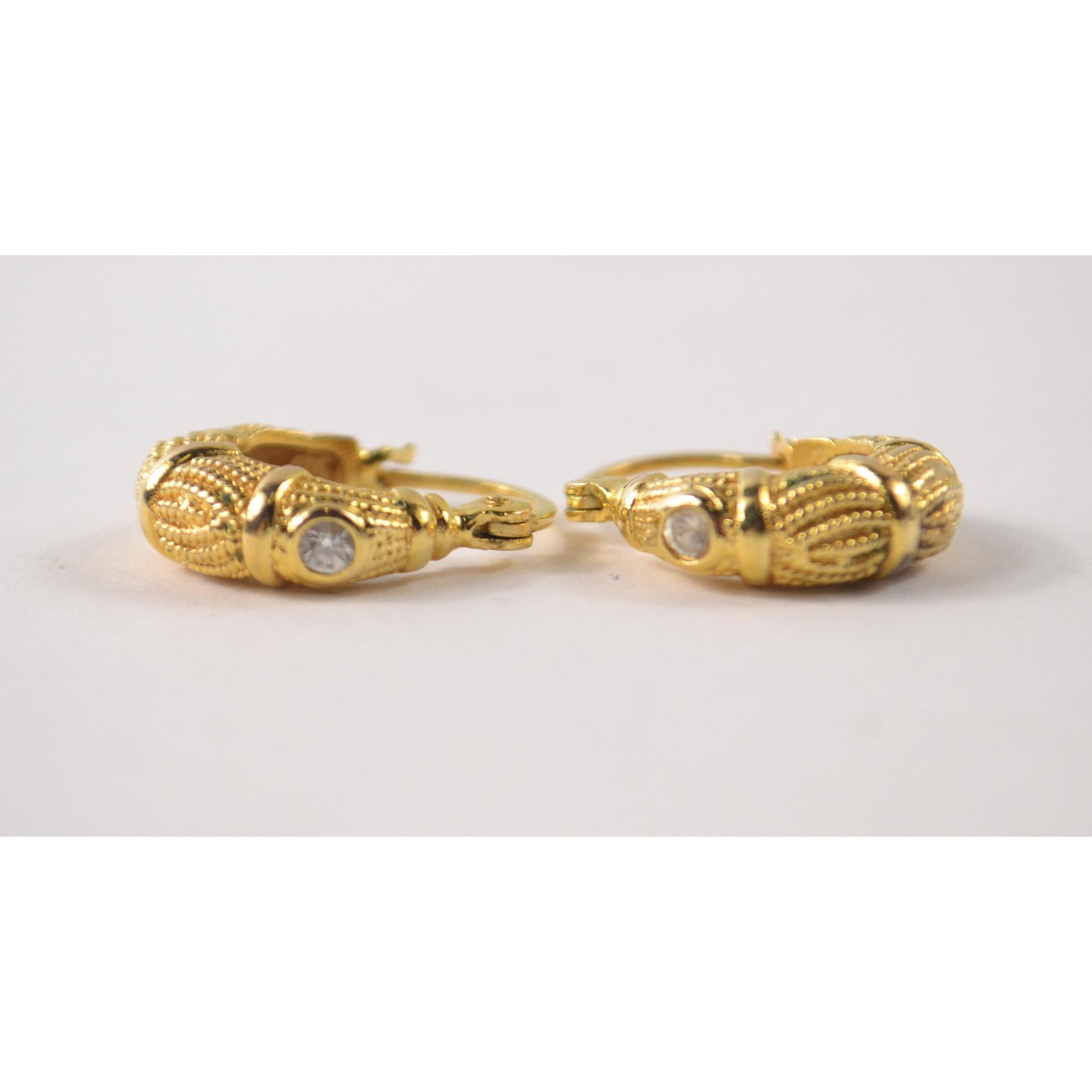 Pair of yellow metal half hoop earrings set with a small clear stone