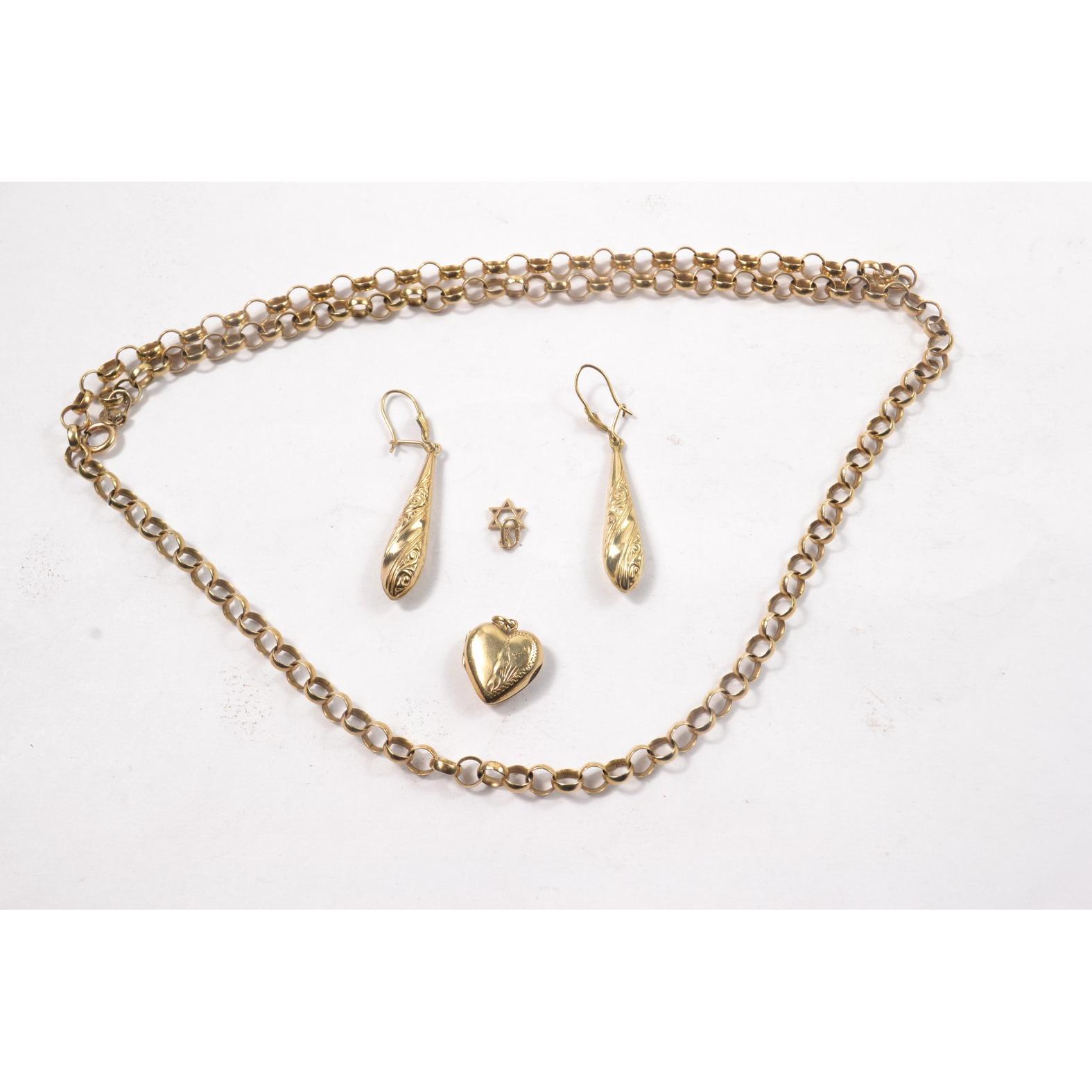 9ct Gold chain-link necklace - weight 17.4g , Length 62 cm with a 9ct heart shaped locket 1.69g gross and a 'yellow metal' drop earrings weight 1.56g gross with a yellow metal tiny 'Star of David' weight 0.25g weight