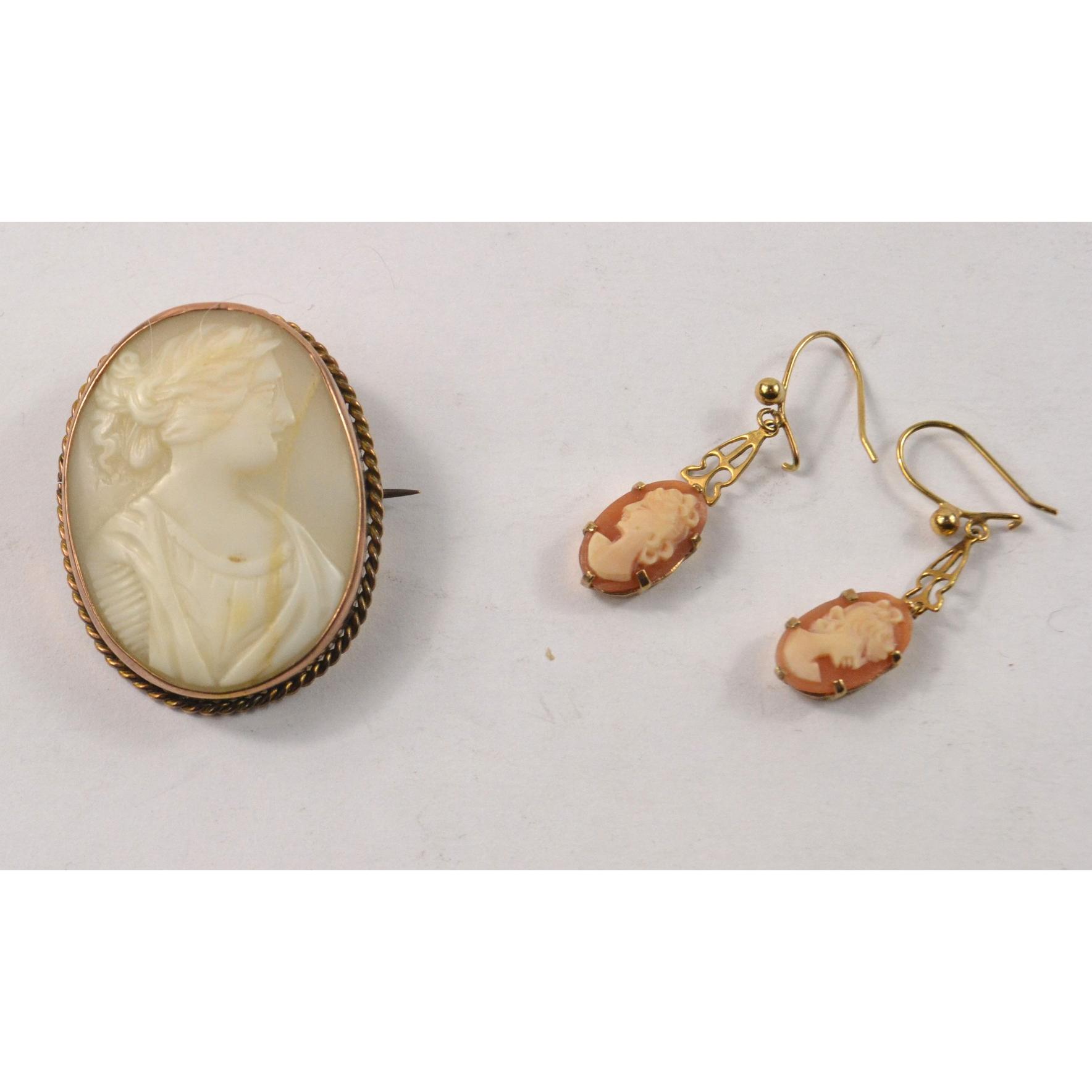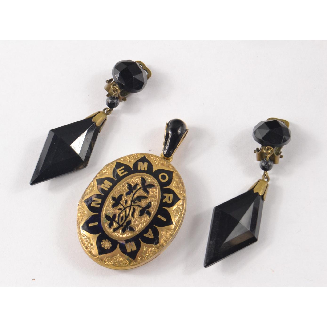 Victorian yellow metal 'IN MEMORIAM' locket and pair of jet style earrings