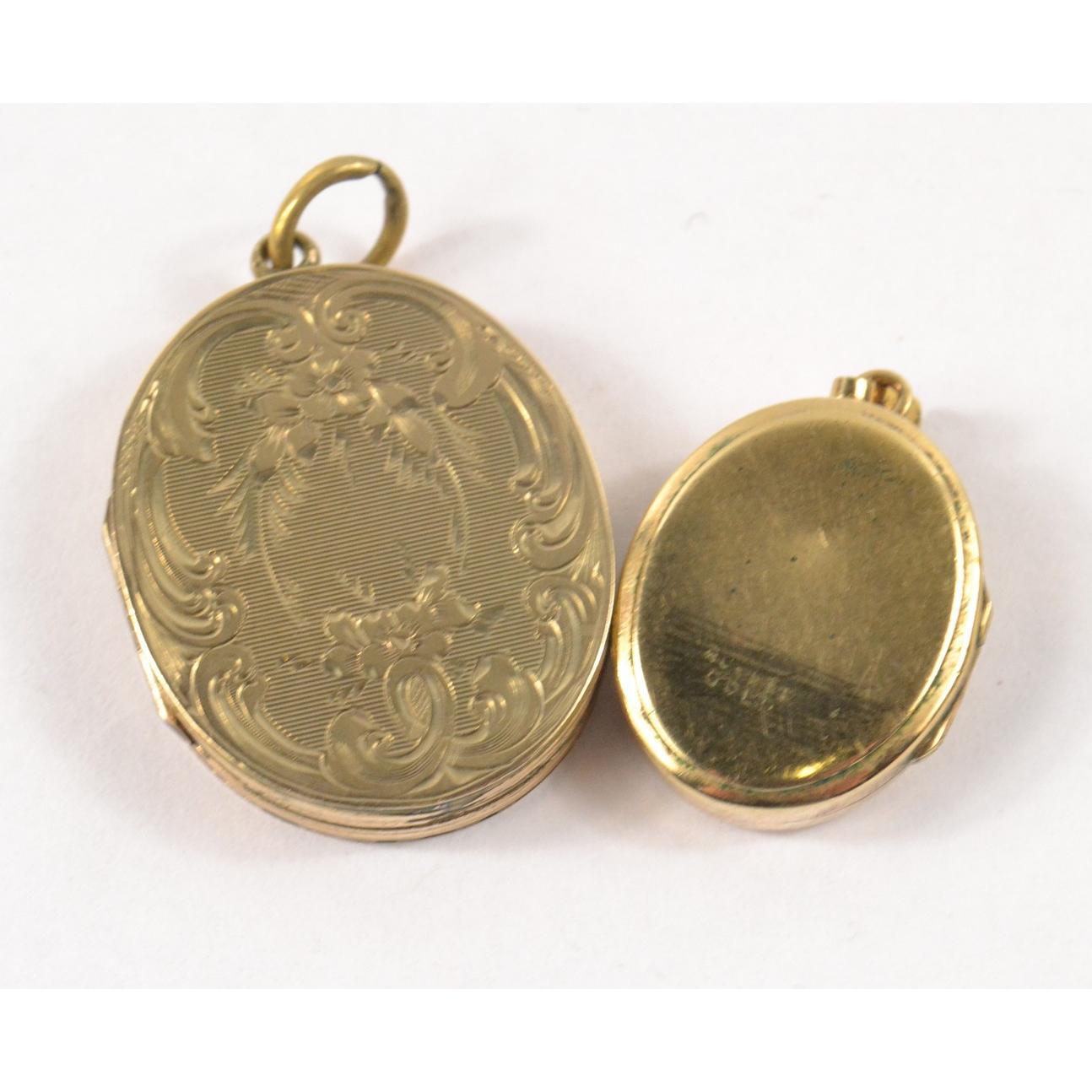 Two oval lockets to include one rolled gold with leaf design on front L: 2cm, other Victorian yellow metal with floral decoration L: 3cm