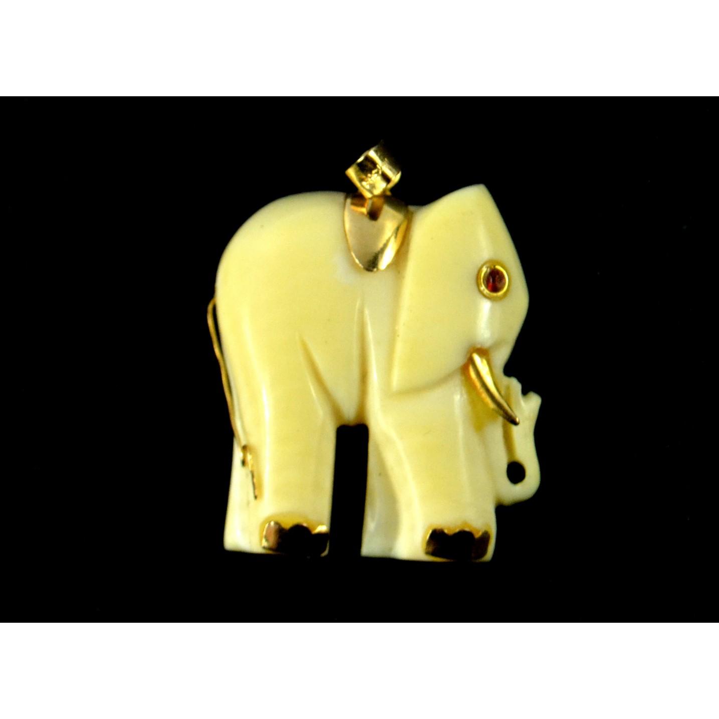 Small bone elephant pendant with a ruby eye and the saddle tusk, tail and feet depicted in 585 gold