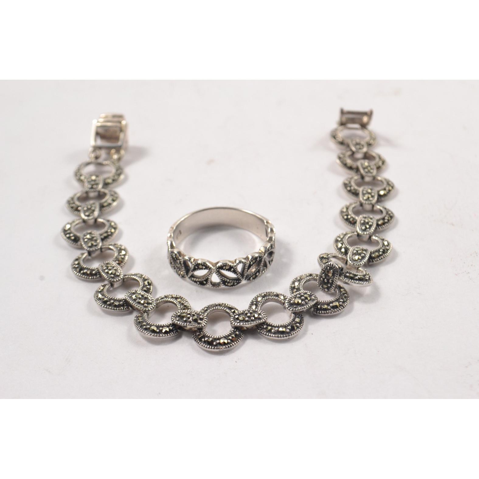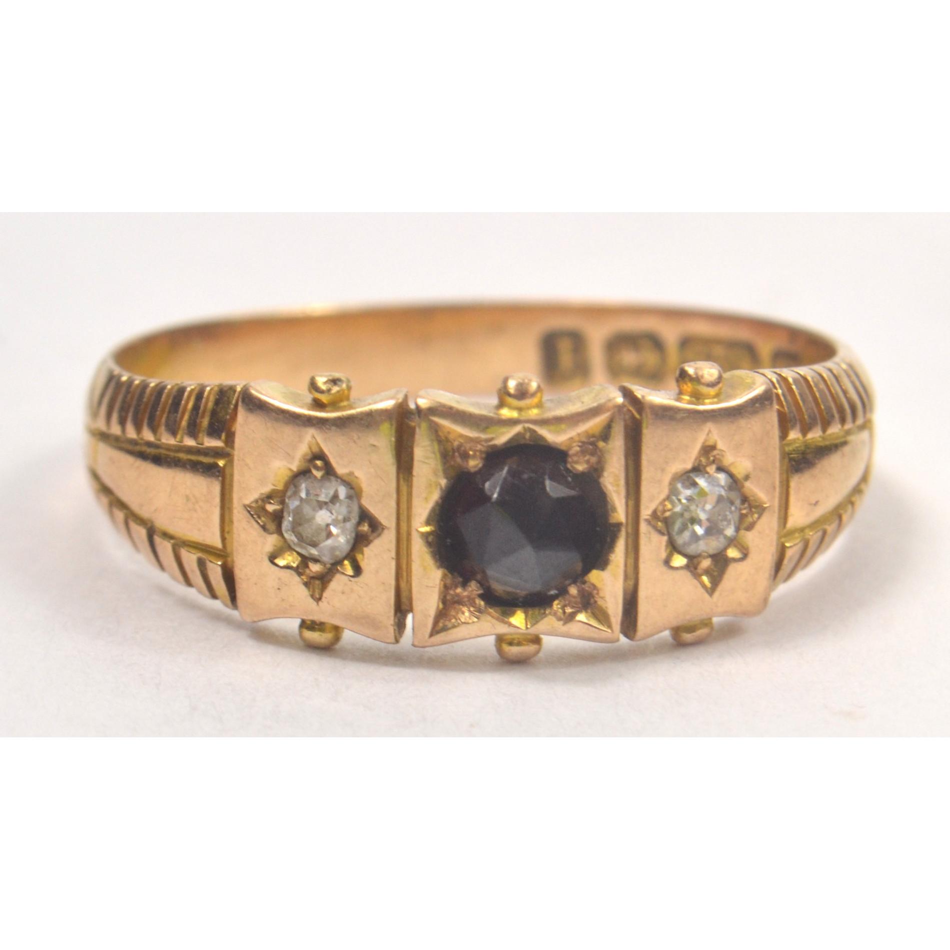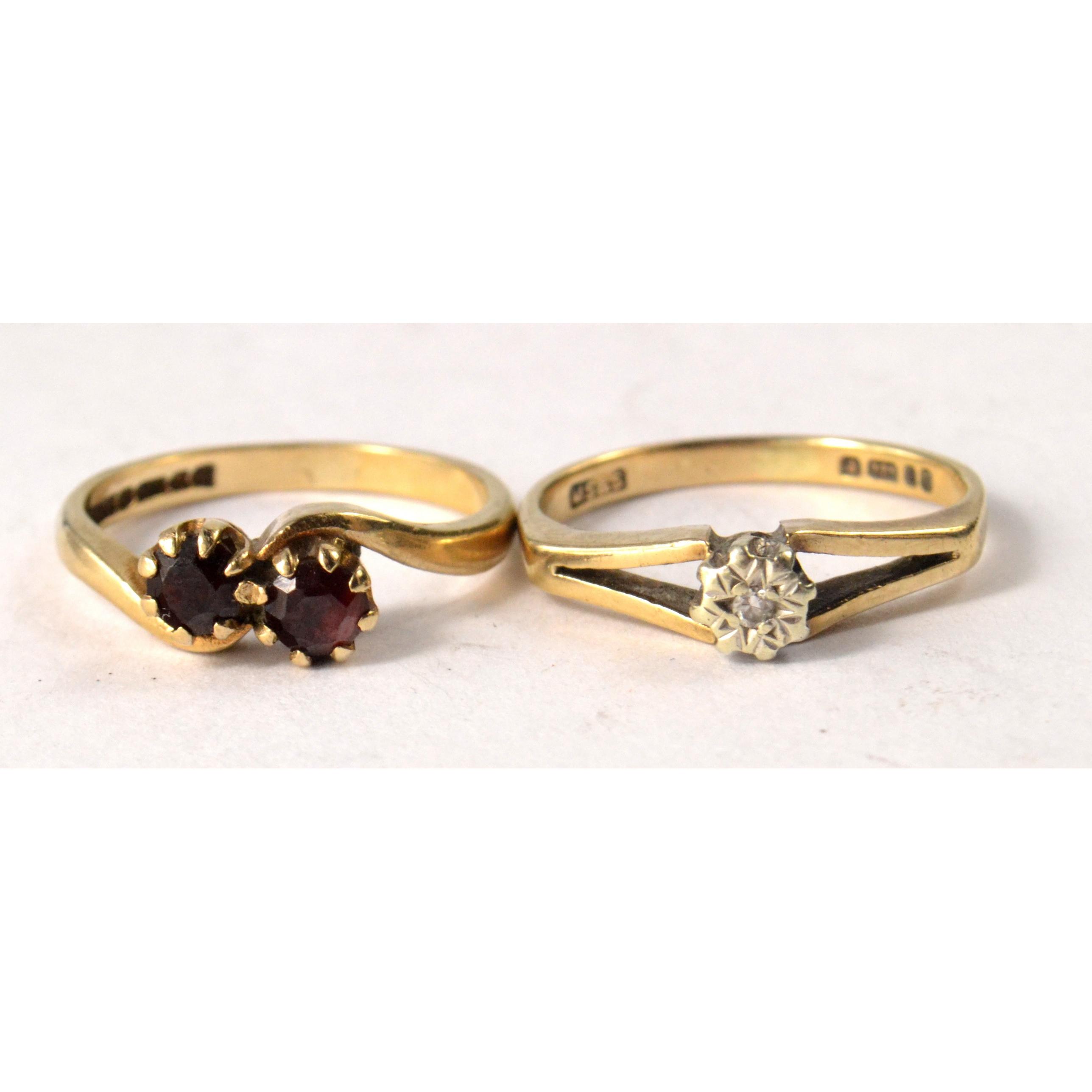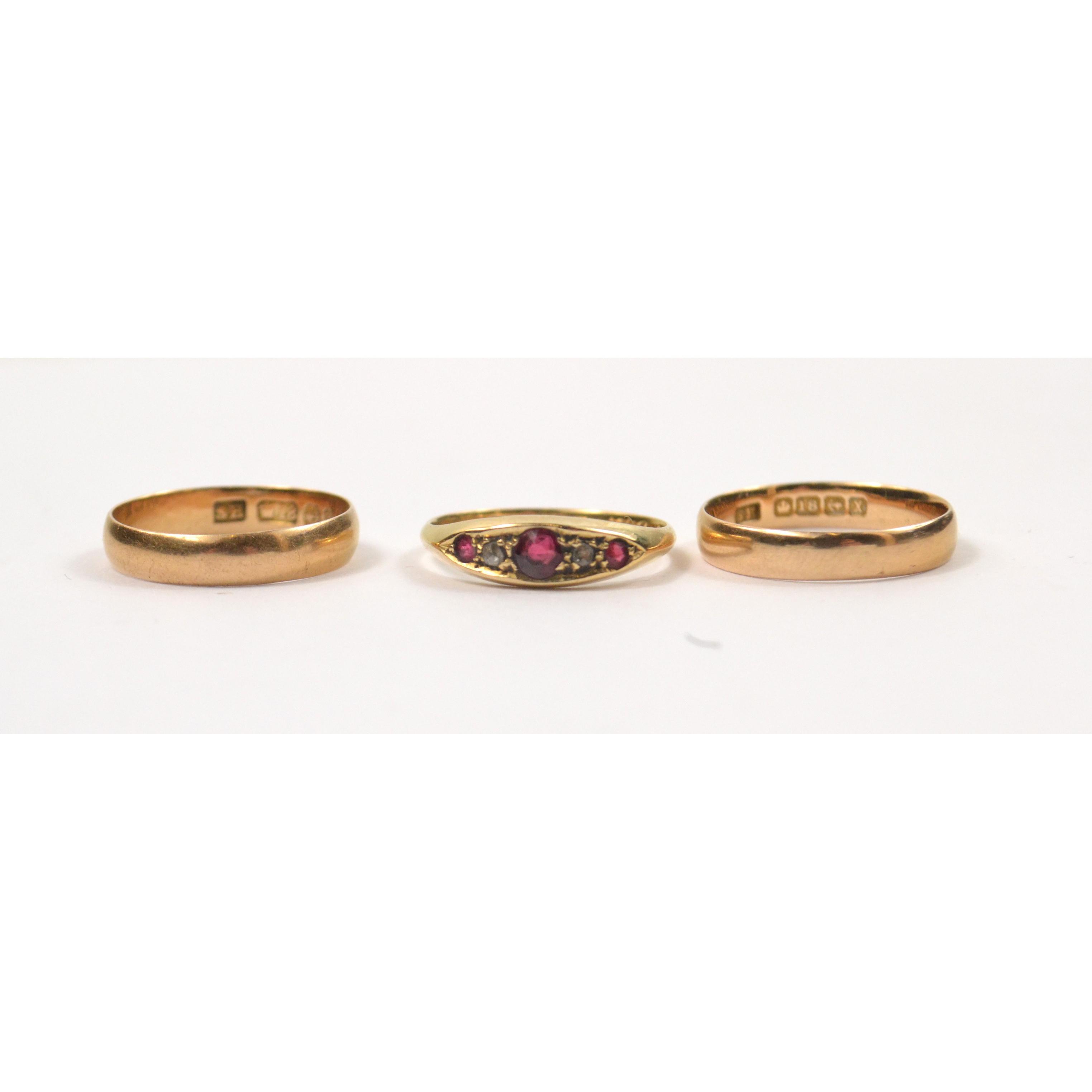 3 x18ct rings to include a dress ring size O with garnets and diamonds, wedding band size O gross weight and wedding band size O weight 7.30g approx