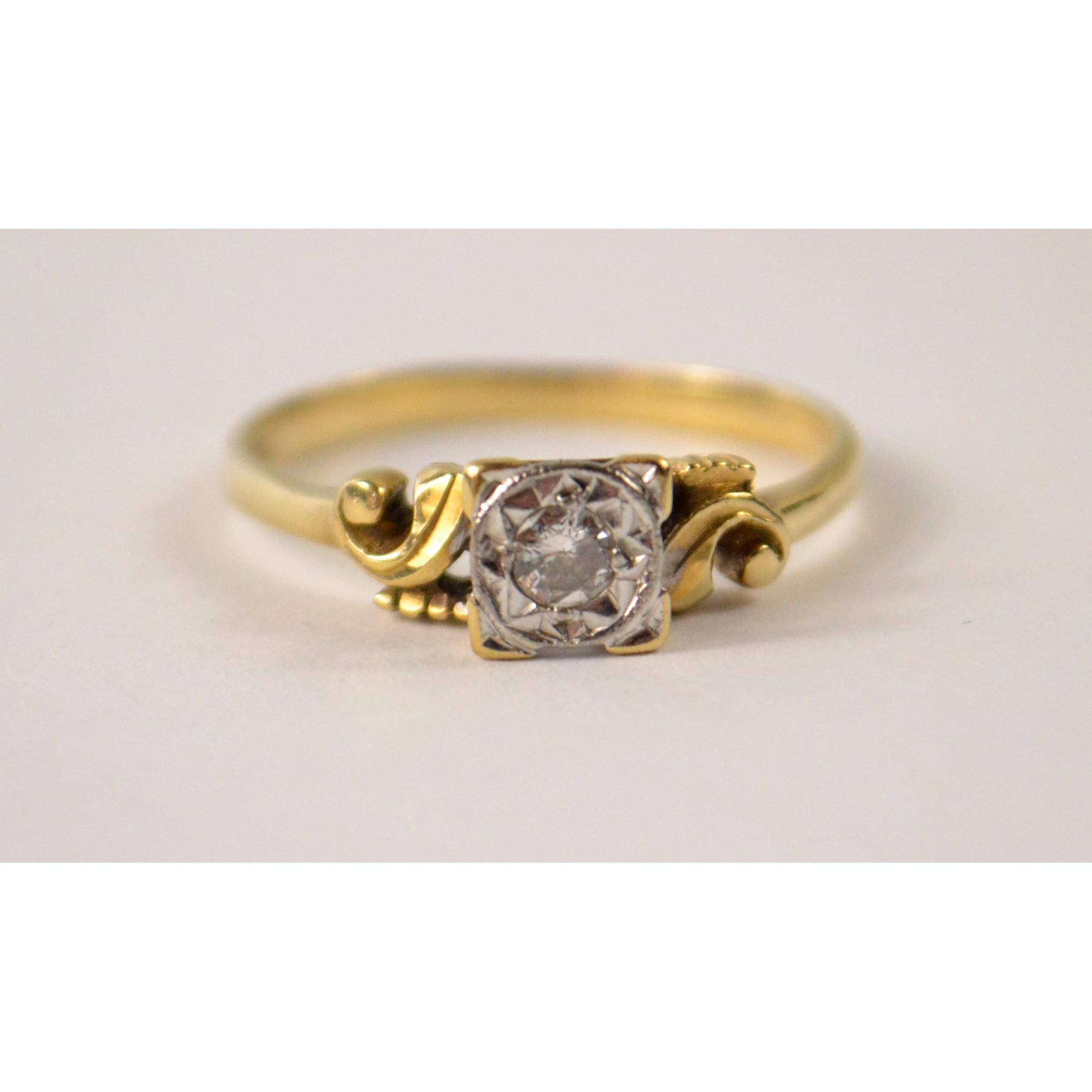 A stamped 375 yellow gold engagement ring with small centered white diamond , gross weight 2.02g size