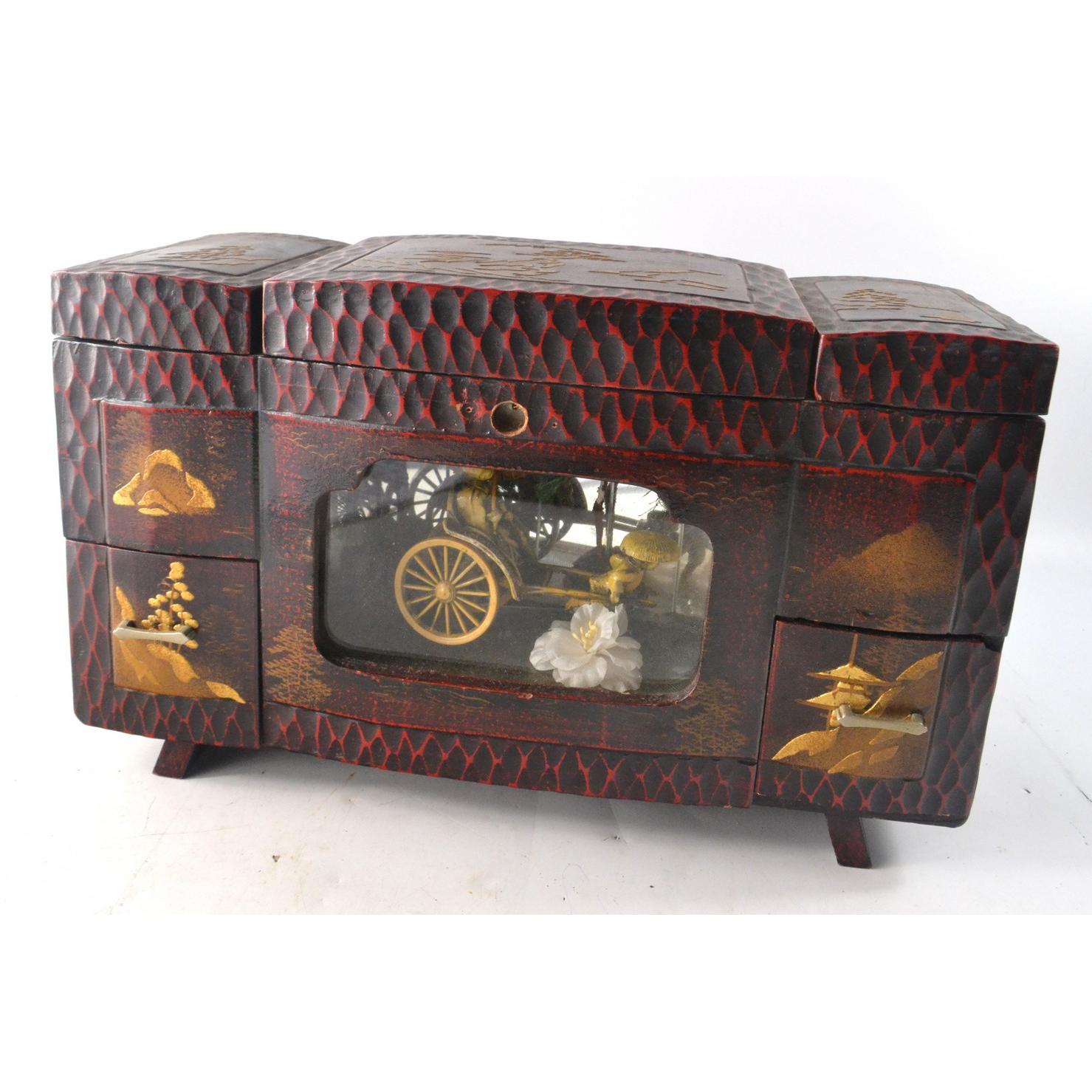 Large antique JAPANESE vase with raised figures playing traditional musical instruments within mountain and lake scenes 44cm tall x 22cm widest point (signed mark to base)