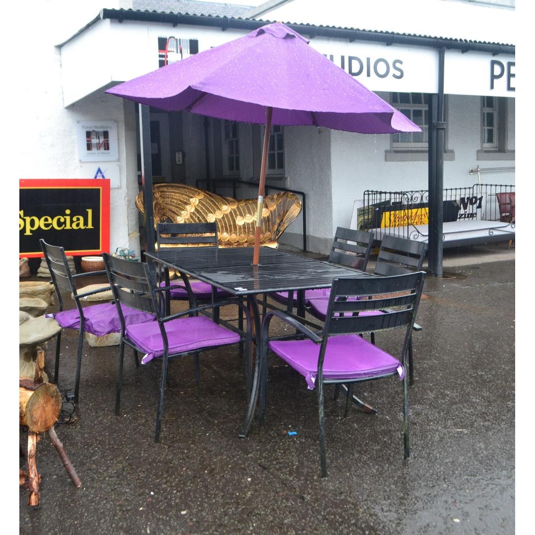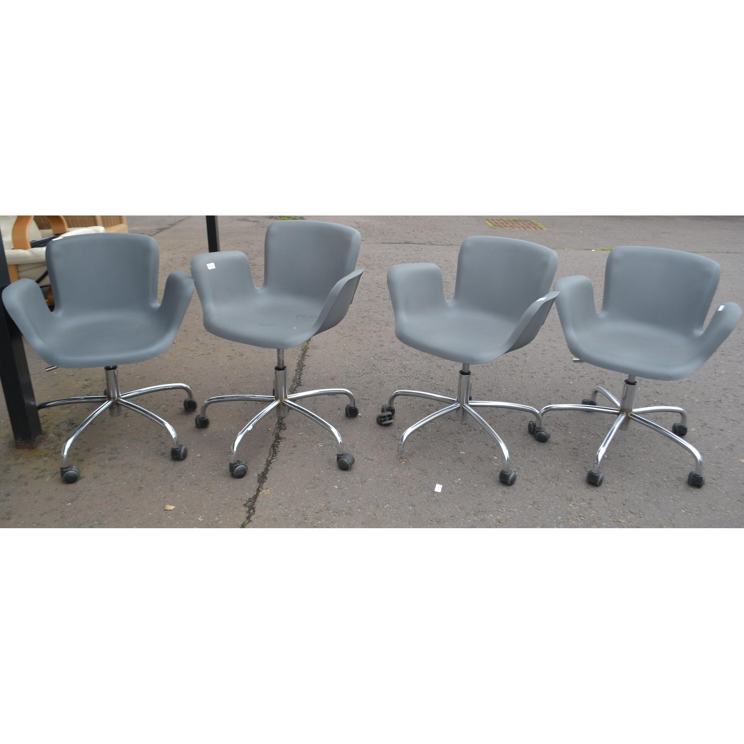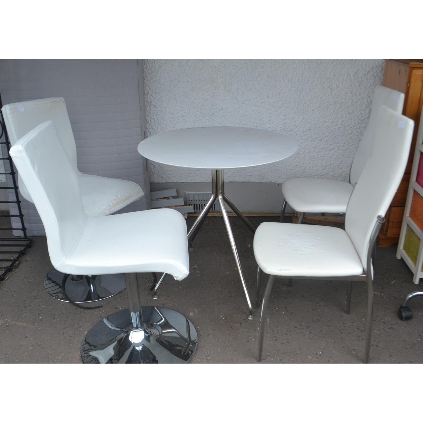 A modern white and stainless steel legged dining table and four white backed chairs, two swivel and two with four legs, slight wear and tear on chairs but a nice wee ensemble!