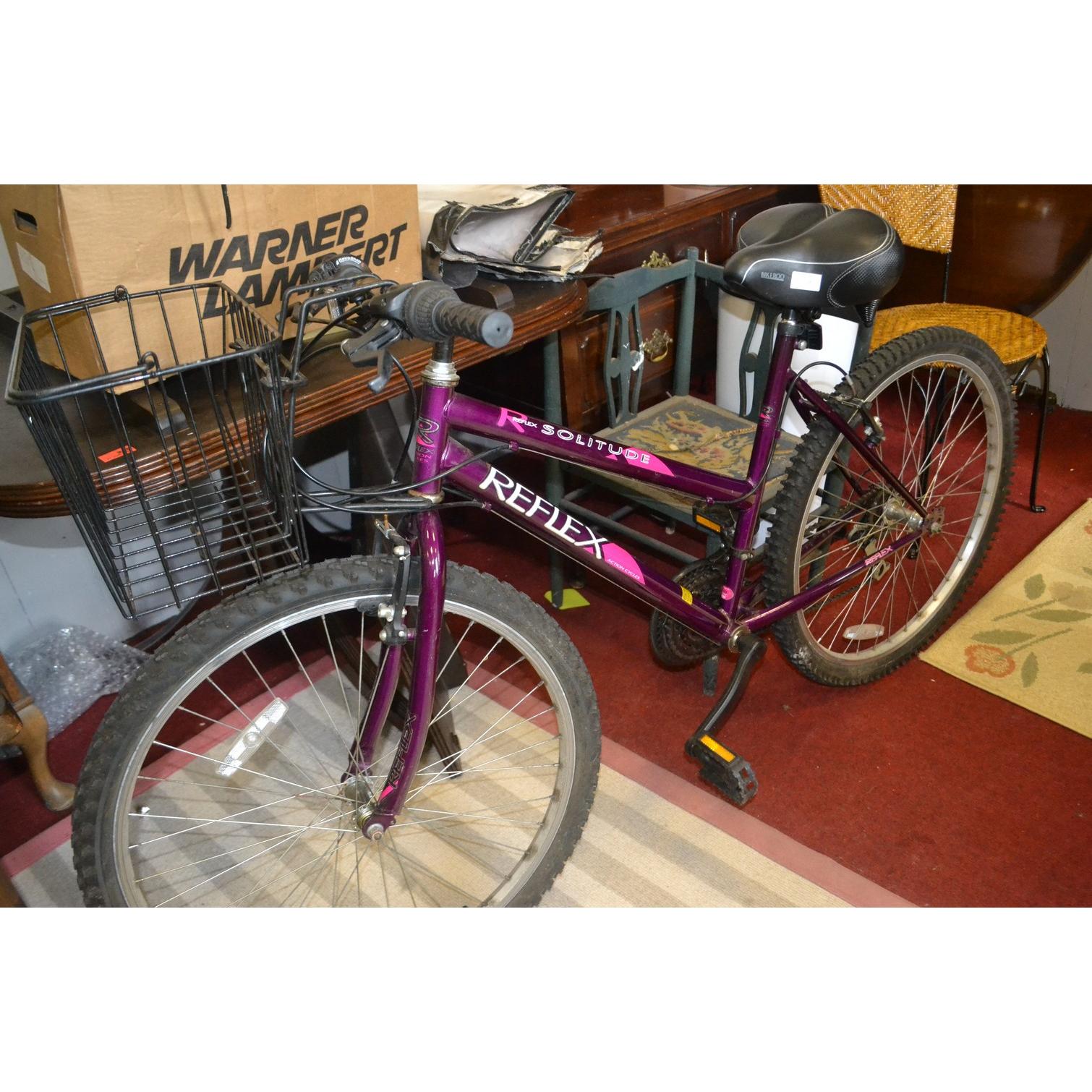 A REFLEX SOLITUDE Ladies mountain bike with SHIMANO gears and a handy Shopping basket In front of the handle bars, bike in purple and pink livery