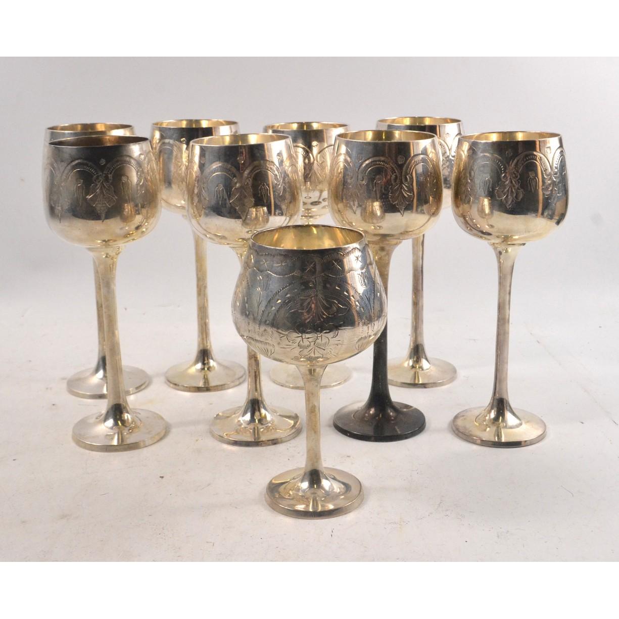 A set of 8 SUPER QUALITY white metal etched tall wine goblets 21cm for that 'special occasion' and one smaller goblet