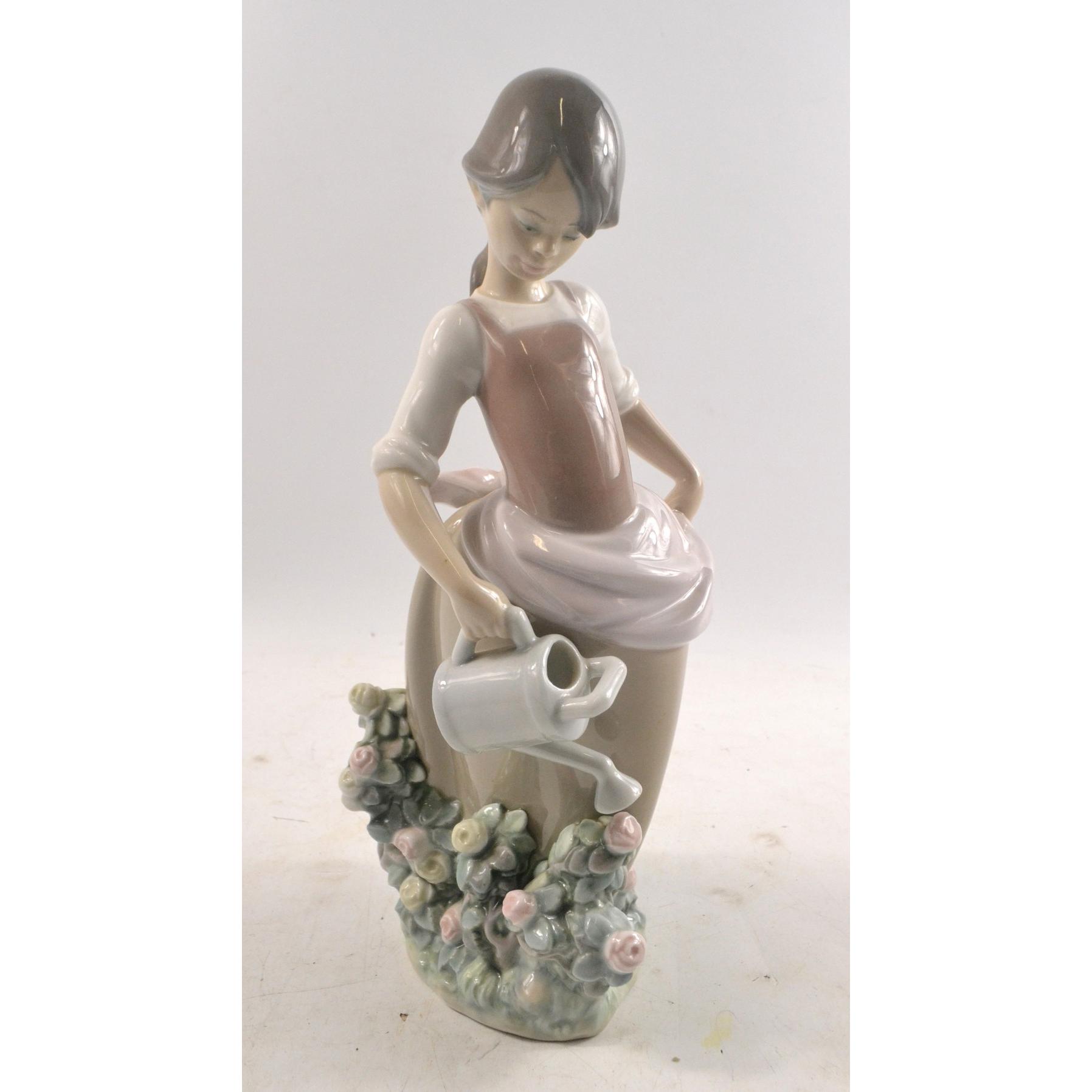Large LLADRO figurine of a Young girl hitching up her apron with watering can on flowers