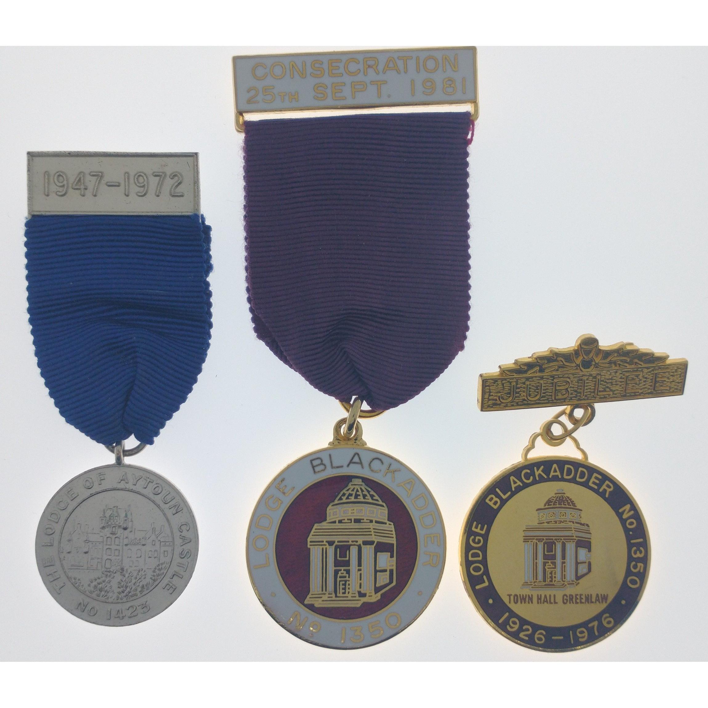 MASONIC AND LOCAL INTEREST A Consecration Freemasonary medallion with ribbon 25th September 1981 BLACKADDER LODGE No 1350, also another BLACKADDER LODGE No 1350 JUBILEE Commemorative pin lapel medallion 1926-1976 also 1947-1972 THE LODGE OF AYTOUN CASTLE No 1423 commemorative penny medallion in white metal with blue ribbon WE CAN SHIP WORLDWIDE!!