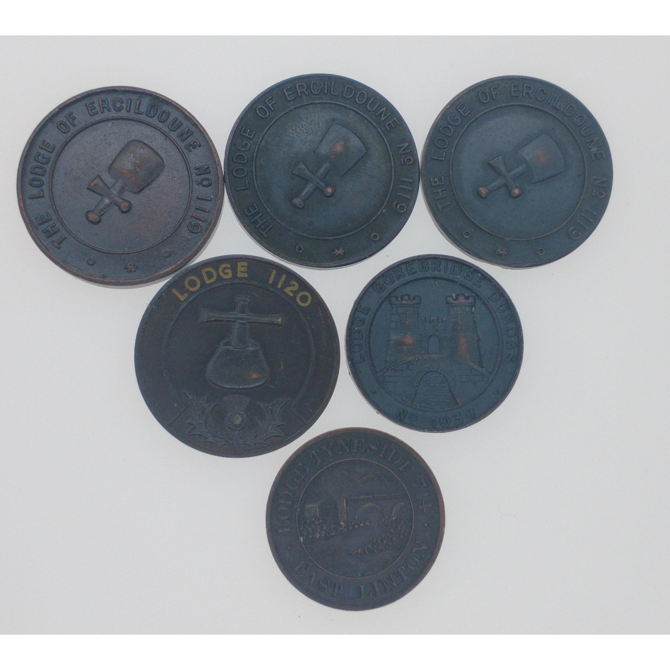MASONIC & LOCAL INTEREST 'They received Every Man A Penny' Masonic Freemason's Mark Token's from The Lodge Of ERCILDOUNE (EARLSTON TOWN SCOTTISH BORDERS)No 1119 x 3 qty, also Masonic Mark Token from EAST LINTON /TYNESIDE LODGE No 714 (DORMANT LODGE) qty 1, also GOREBRIDGE/DUNDAS Lodge No 1039 and lastly Kyle and Bute? No 1120 Mark Token WE CAN SHIP WORLDWIDE!!