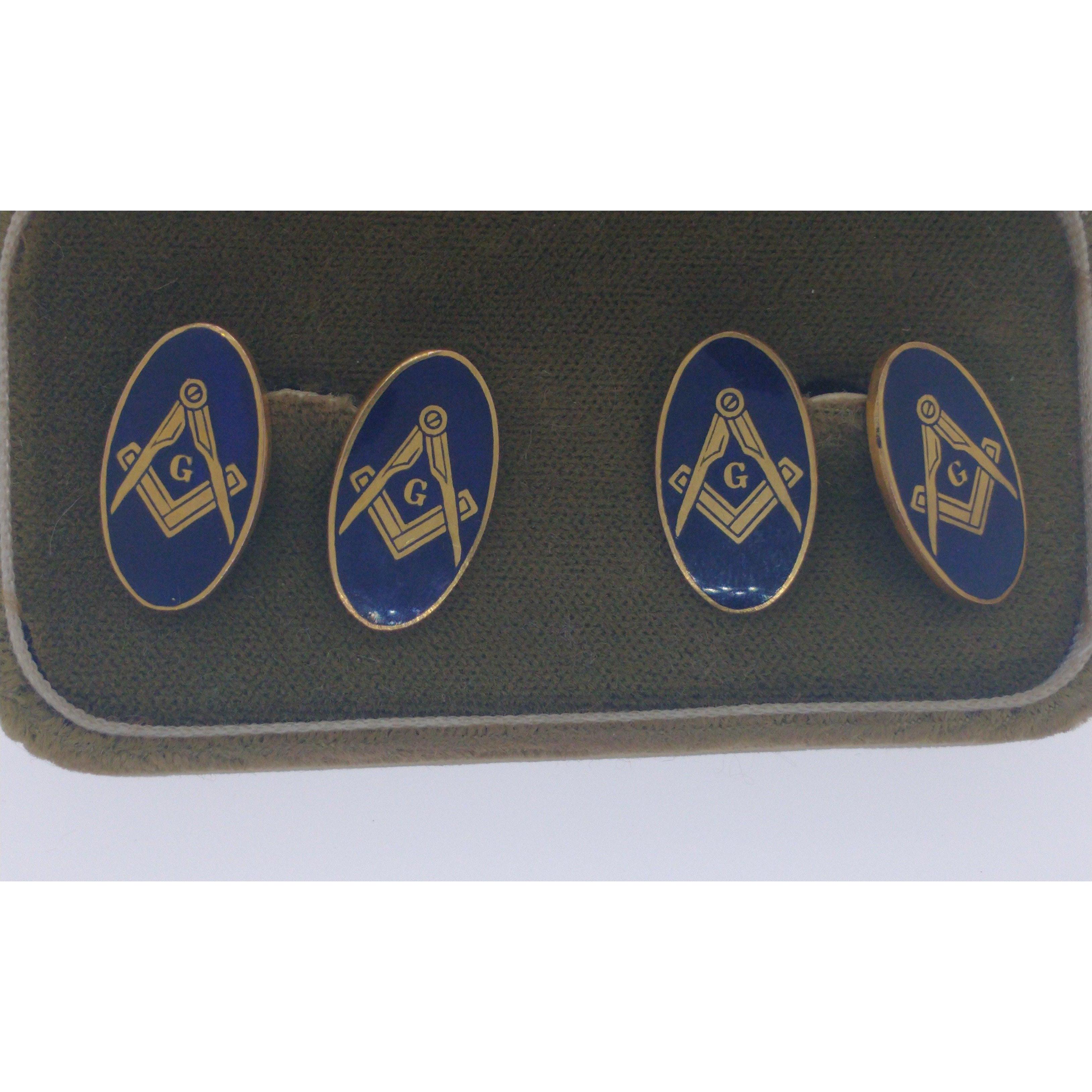 MASONIC & HAWICK INTEREST - A Pair Of 375 stamped yellow gold Cuff-Links with G Symbol Masonic regalia with the Masonic SQUARE & COMPASS, also stamped with goldsmith letters JHW 2cm in length each with original JAMES INGLES jeweller's of Hawick presentation box, weight gross 8.84g WE CAN SHIP WORLDWIDE!!