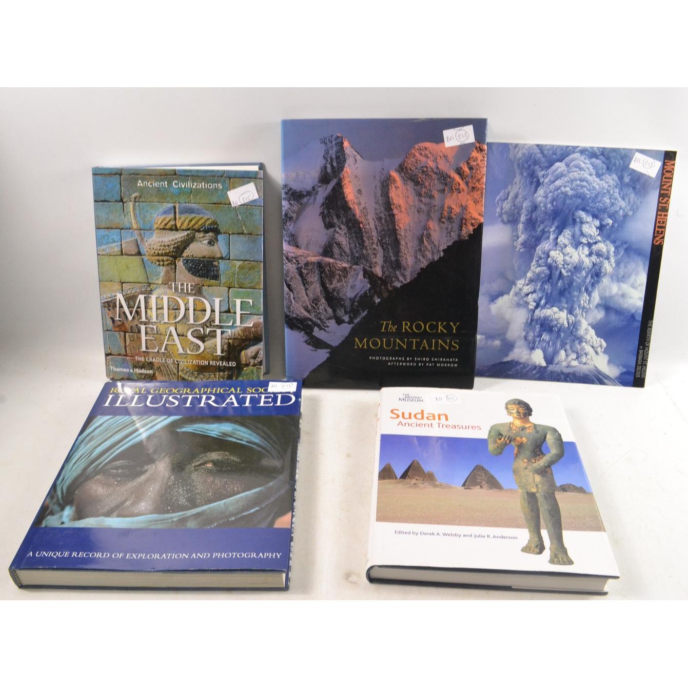 FIVE SUPER QUALITY!! books entitled Royal Geographical Society Illustrated record on exploration and photography, an Illustrated book on Mount St Helens by Barbara Decker, also The Rocky Mountains photographed by Shiro Shirahata, The British Museum The SUDAN Ancient Treasures and lastly Ancient Civilizations The Middle East bu Thames & Hudson