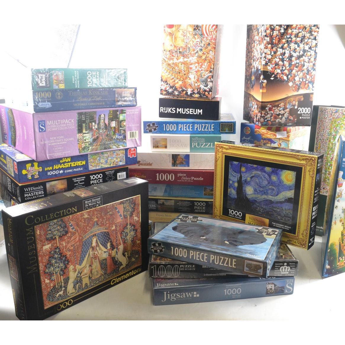 VERY LARGE Selection of jigsaw puzzles TO INCLUDE Fristy Morn 1000 piece, Dtarty Night 1000piece, The Gighting Temeraire 1000, Crazy World Cup 4000 piece, Museum 2000 etc etc etc all in new condition and SUPER QUALITY!