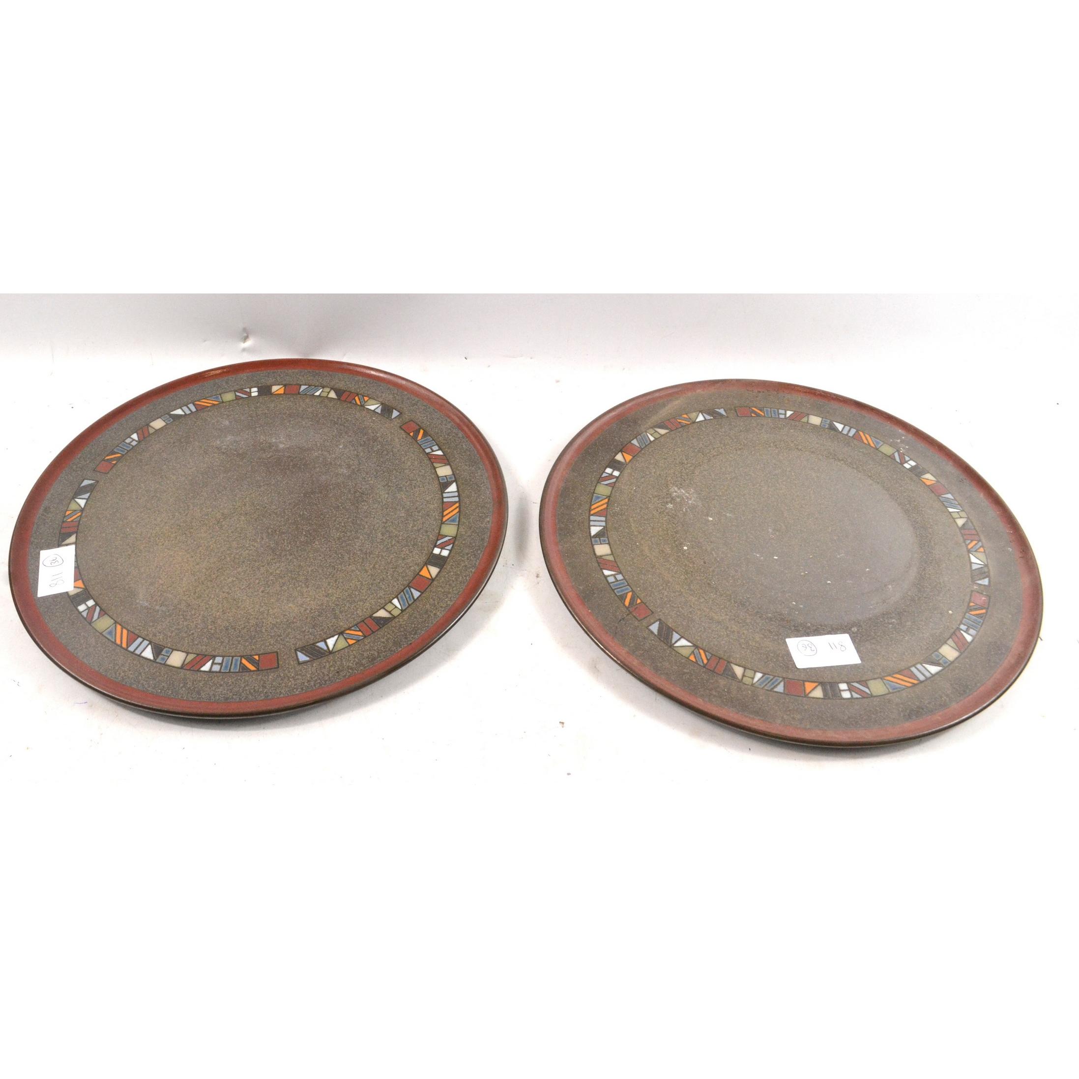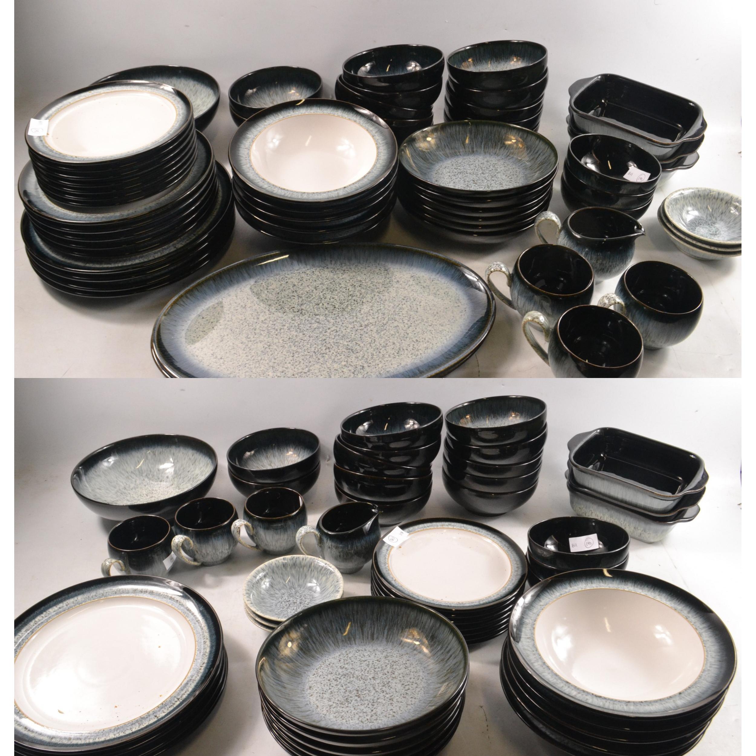 DENBY HALO pattern AA black and white service plates, bowls, side plates, cups, jug, pasta bowls, small dessert bowls, Vegetable platters and 2 large charger plates and a fruit bowl etc etc