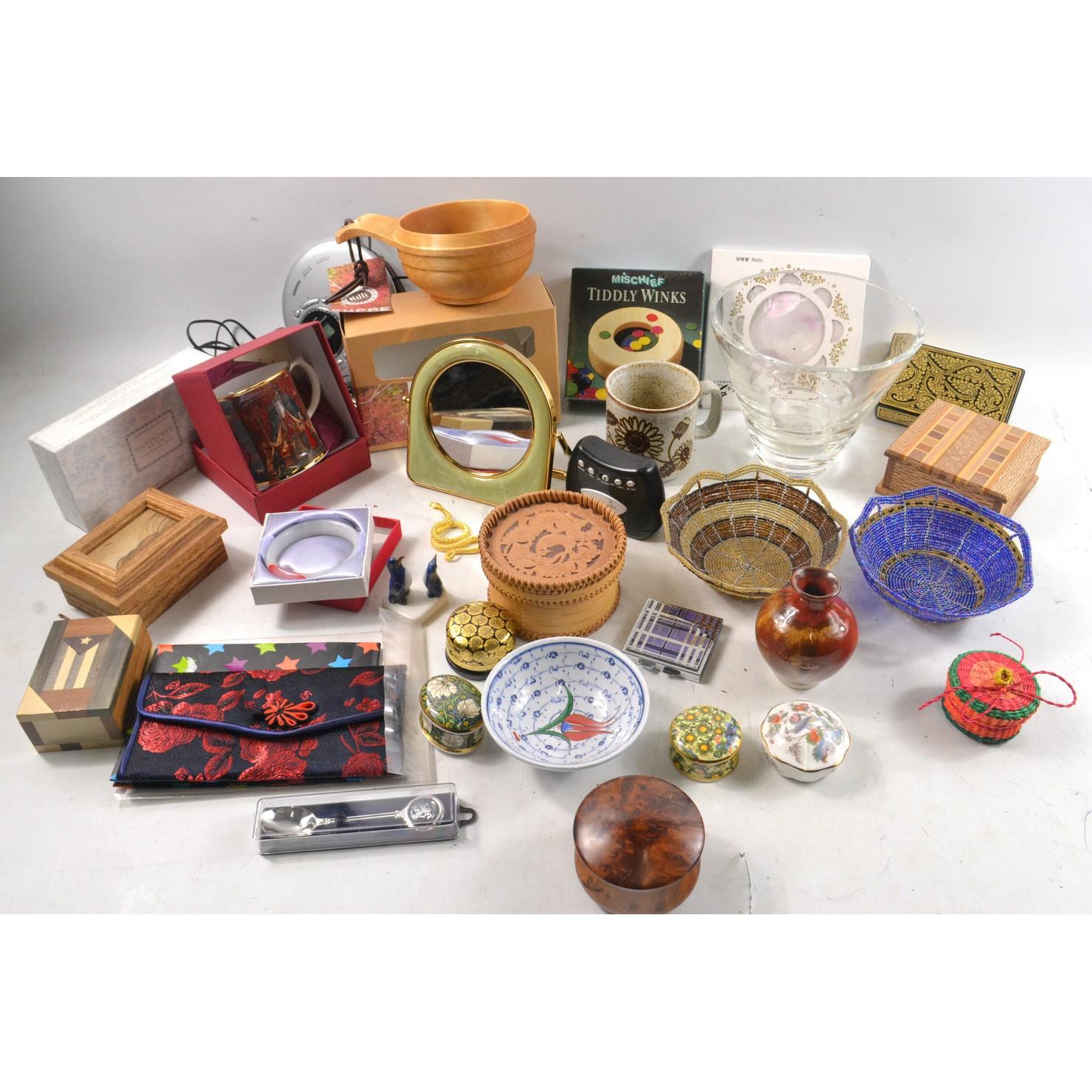 SUPER QUALITY ITEMS mixed box to include fine bone china mug still boxed(£25) scented bath salts, Tiddly Winks boxed new, beautiful handmade boxes and a large hand blown glass vase etc etc