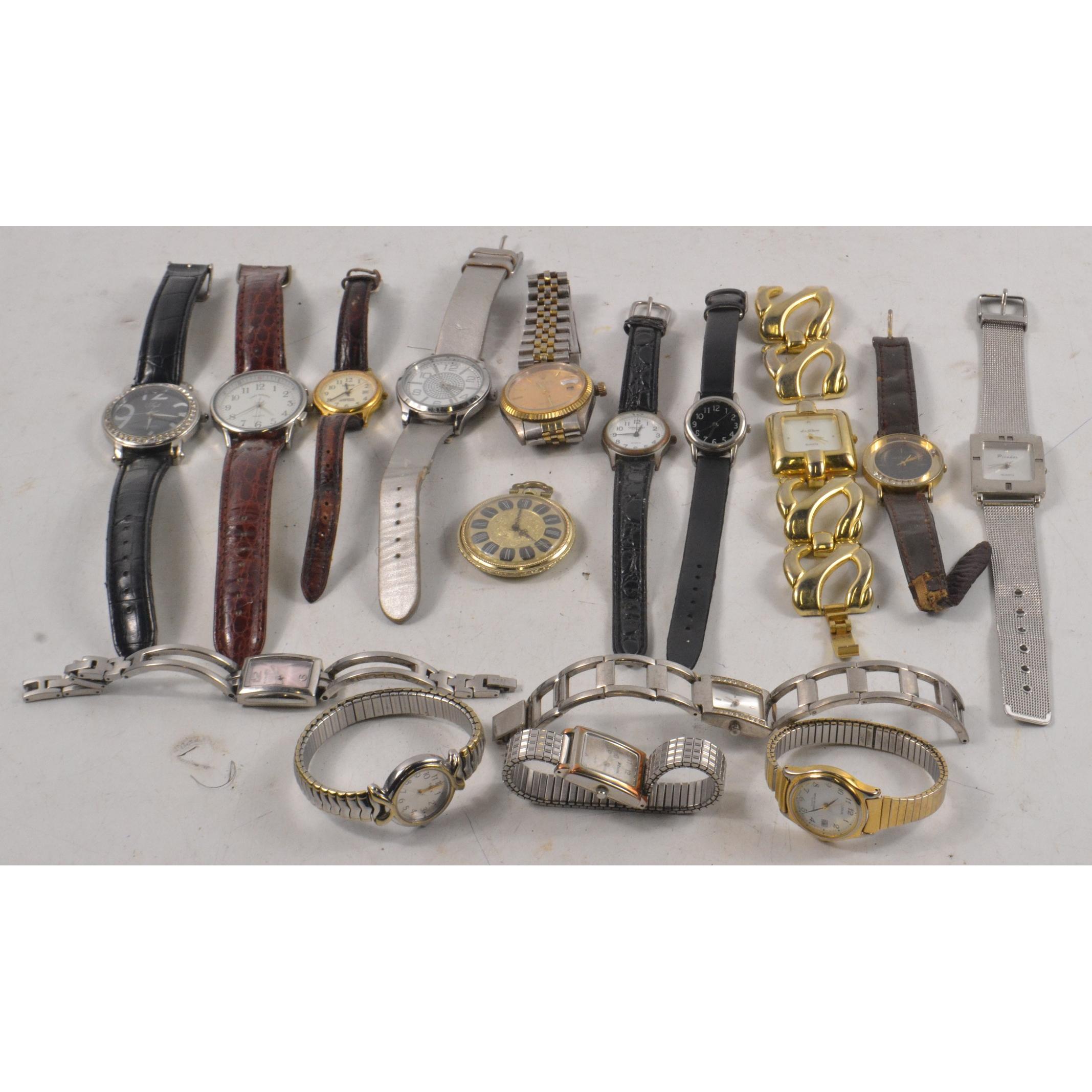 A collection of unisex wrist watches to include a ROLEX STYLE perpetual datejust watch with other names such as Louis Valentin, FOSSIL, LORUS, RAVEL, TIMEX etc etc