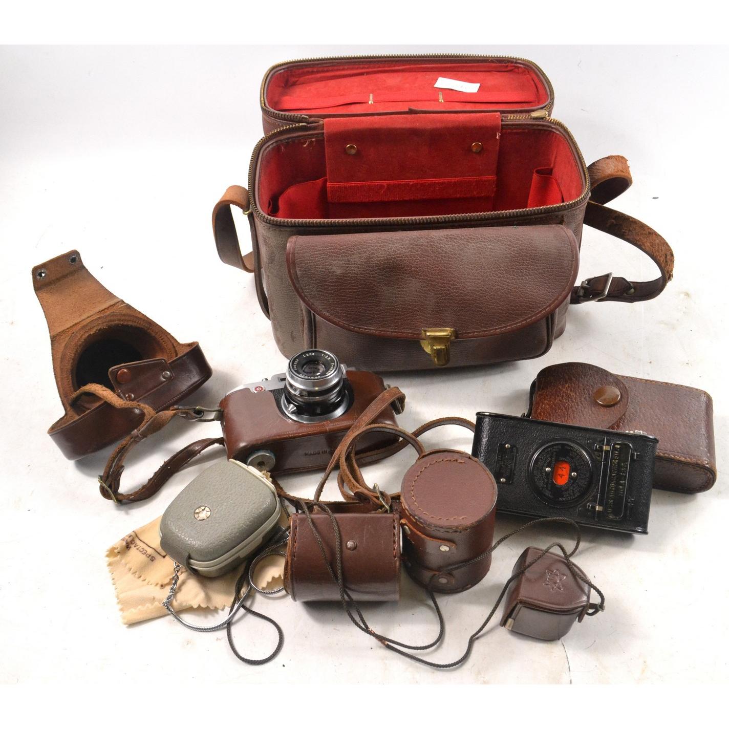 A large collection of high quality vintage cameras, lenses and accessories in original cases to include: KODAK ball bearing shutter camera, REX Japanese made LUNA camera, REX accessories - telephoto lens and telephoto viewer, NK Japanese made attachable light meter, STAEBLE-TELEXON 5.6/85mm lens and a Belichtungsmesser GOSSEN SIXTINO West German made light meter with original chain, plus a vintage SELVYT cloth and two other lenses