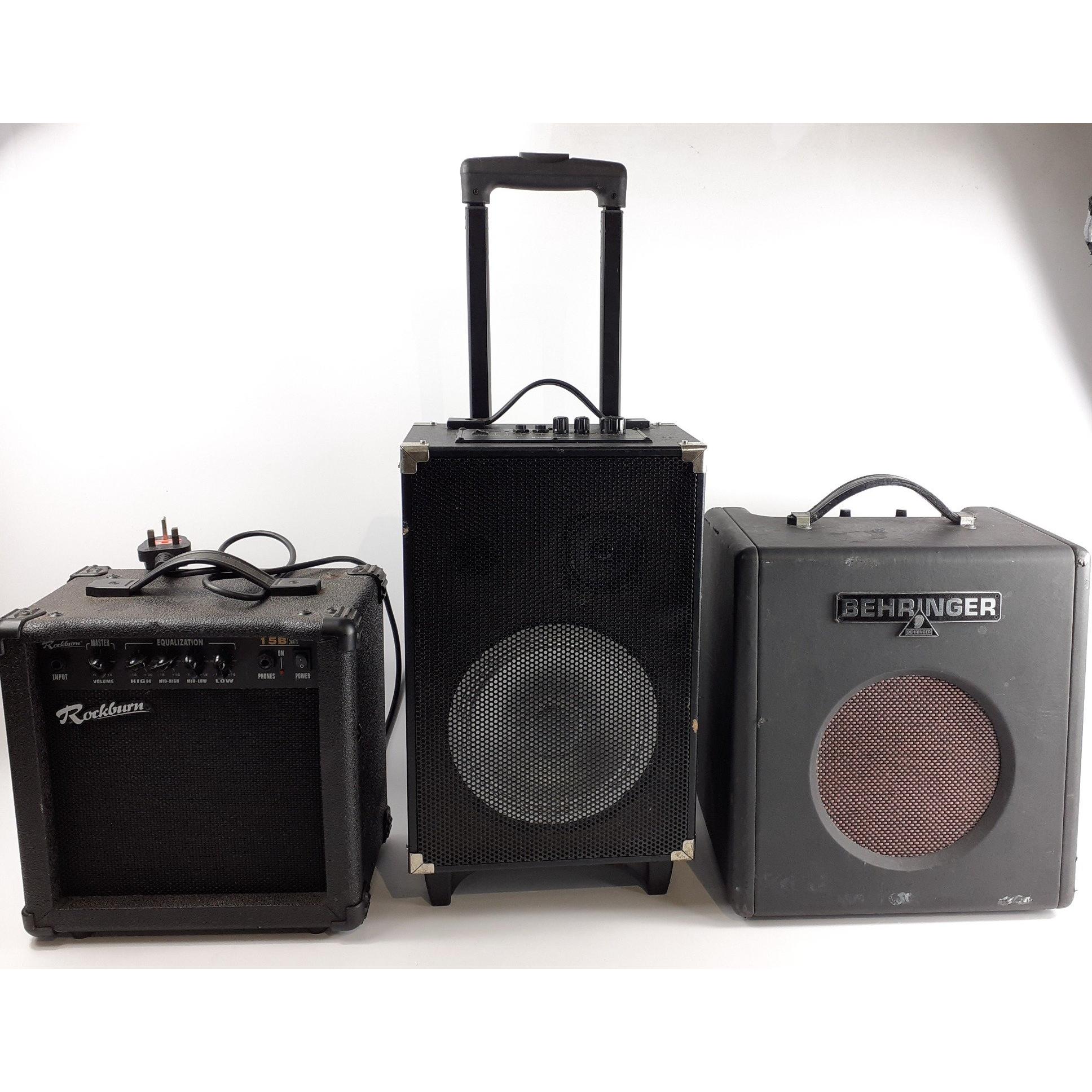 Three portable amplifiers a BEHRINGER Thunderbird BX108 (35cm tall), a ROCKBURN 15B 15W (30cm tall), and an INTEMPO amplifier on wheels
