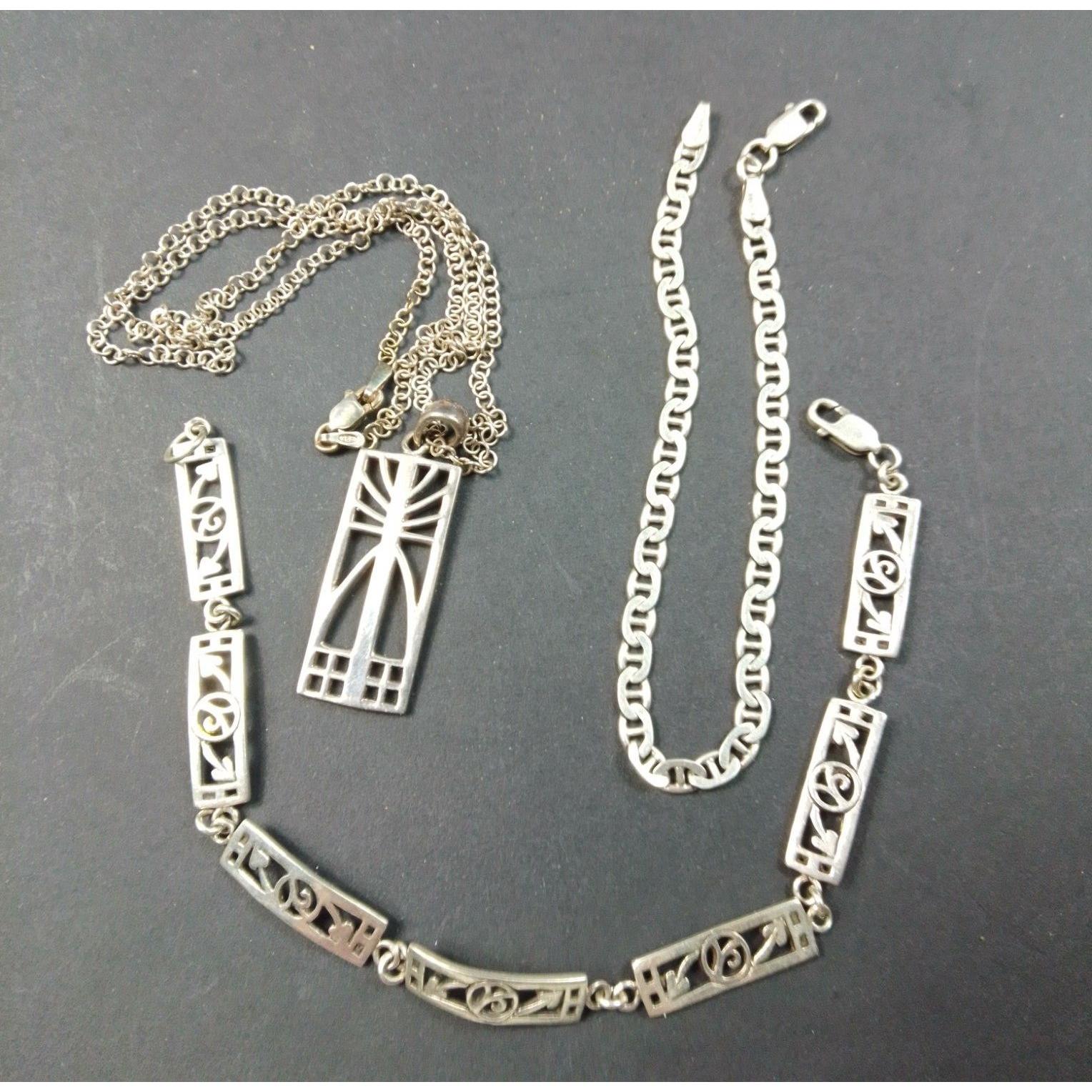A RENNIE MACKINTOSH style pendant stamped 925, 30mm long on a 925 stamped chain (44cm approx) plus 2 x 925 stamped bracelets 18cm long approx, weight 19.35g approx