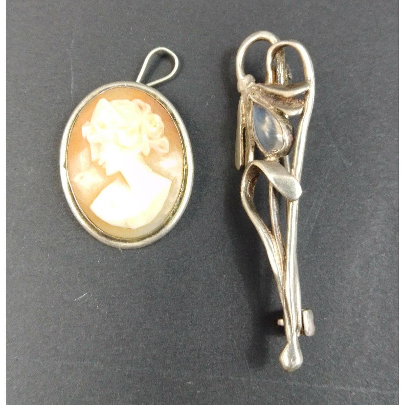 A pretty snowdrop shaped brooch with opalescent stone in centre (1cm long), hallmarked for Edinburgh 1986, brooch length 4cm long approx, gross weight 2.69g approx plus a cameo pendant with unclear marks 2cm long