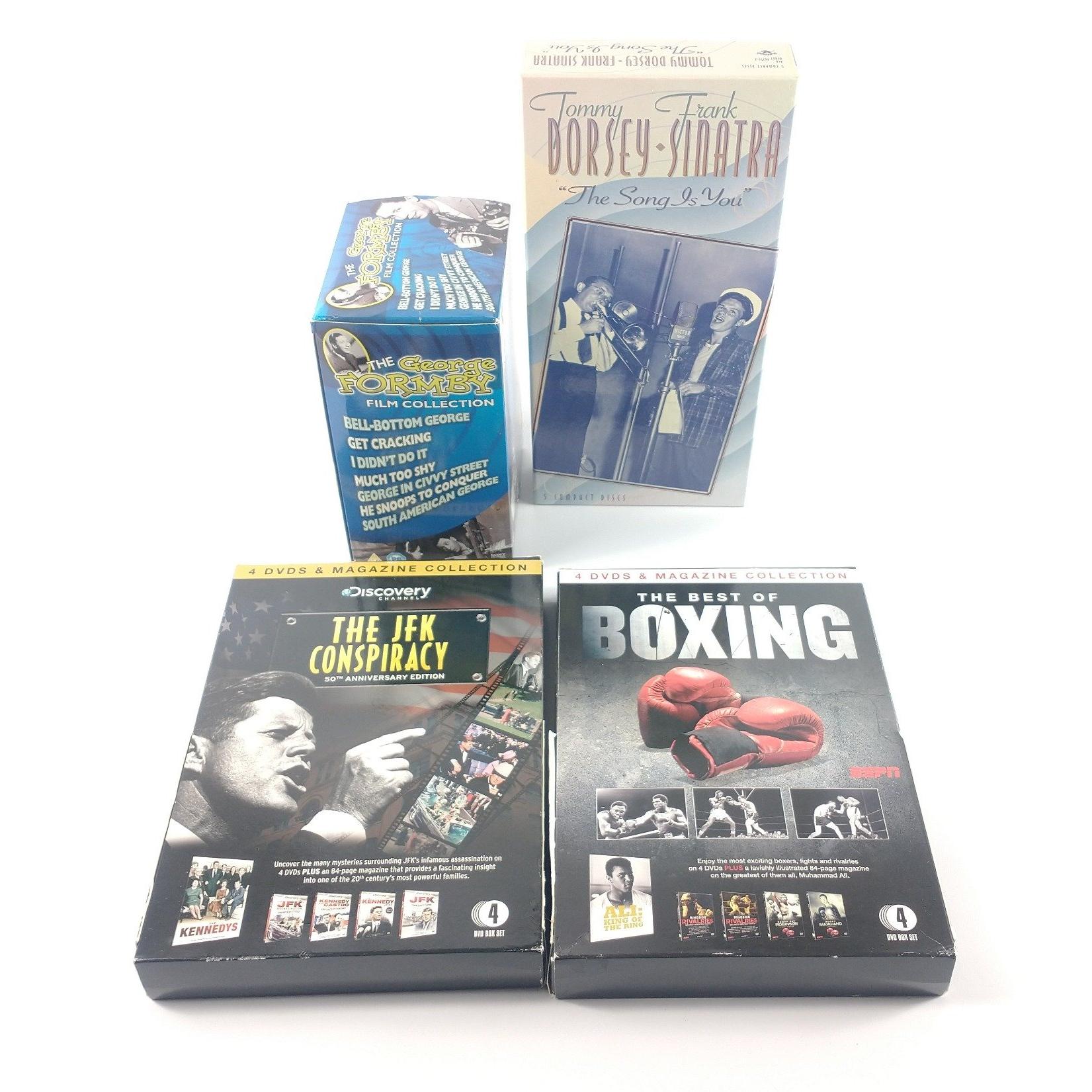 A collection of DVDs to include the George Formby film collection, the JFK Conspiracy, Boxing collection, and Tommy Dorsey & Frank Sinatra CD collection