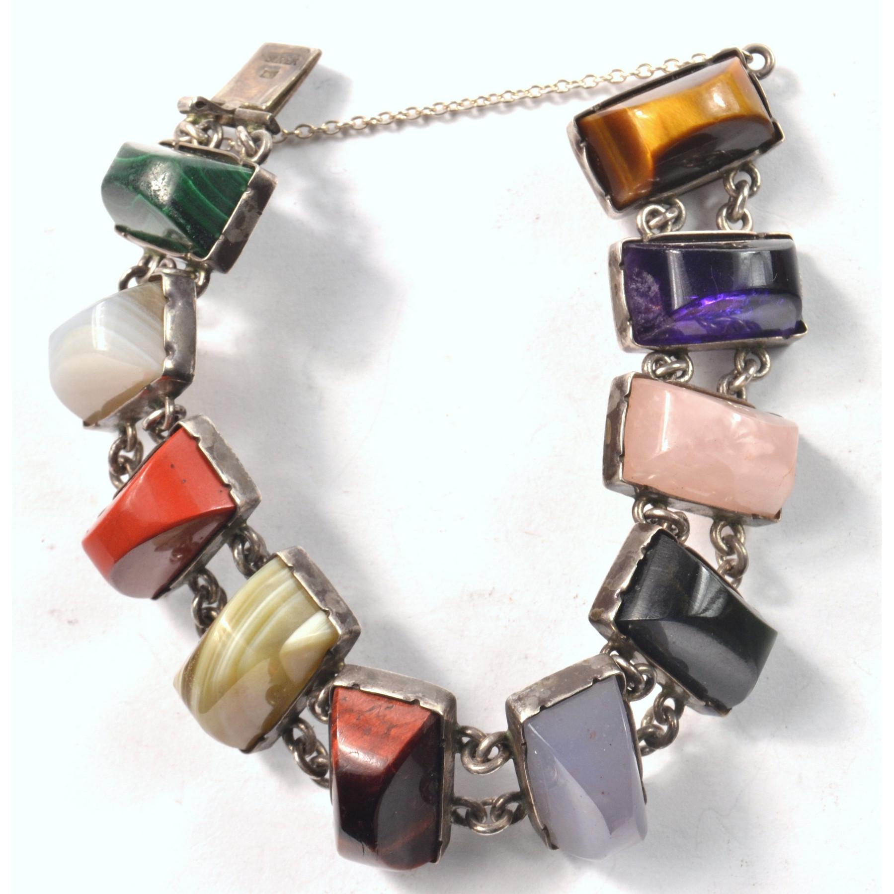 Victorian silver bracelet set with 10 multi coloured Scottish agate.