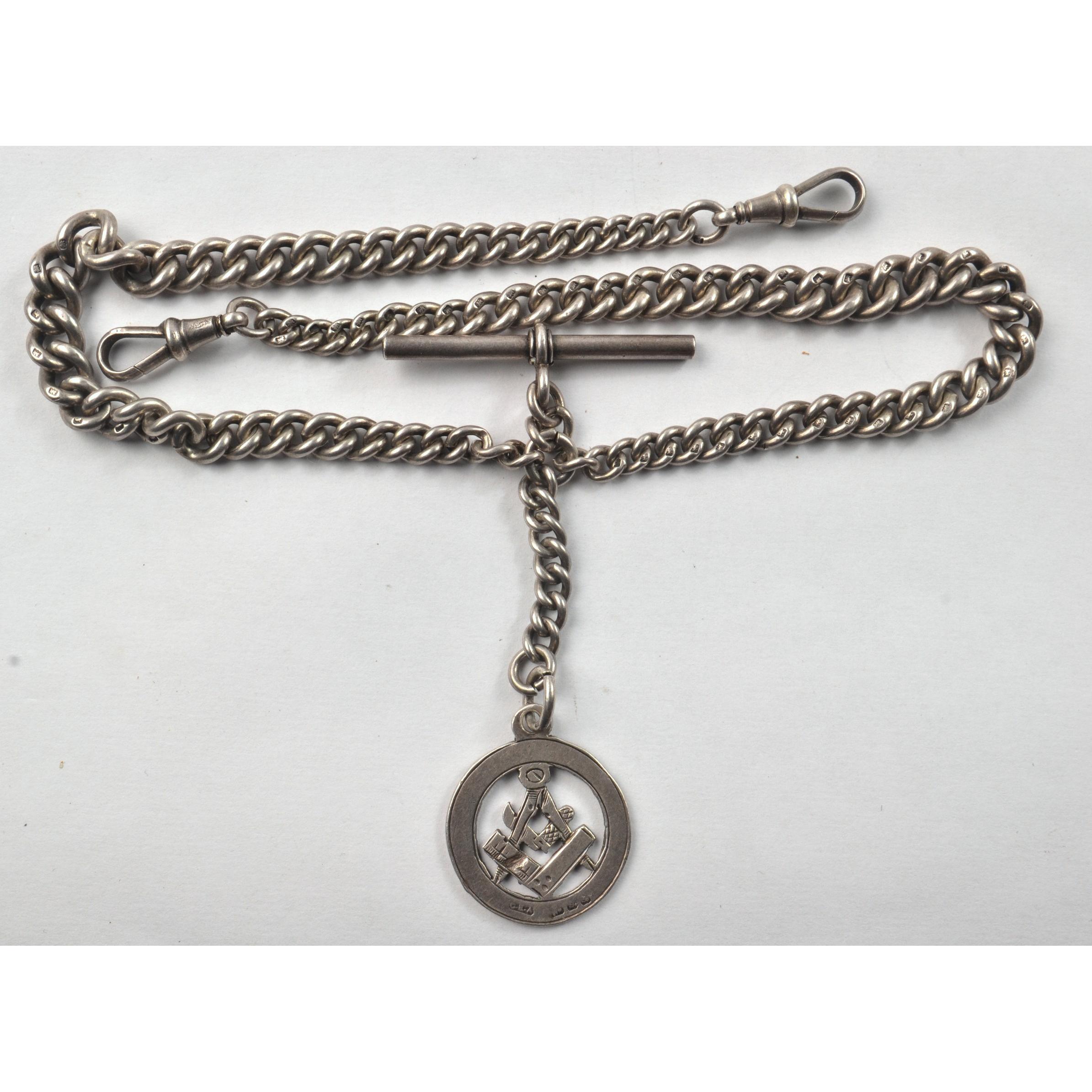 Antique SilverLion 'W' Hallmarked watch chain with bar, each link is individually Hallmarked Lion stamped! It has also a silver masonic medallion fob attached - Really Special!! 57g weight approx