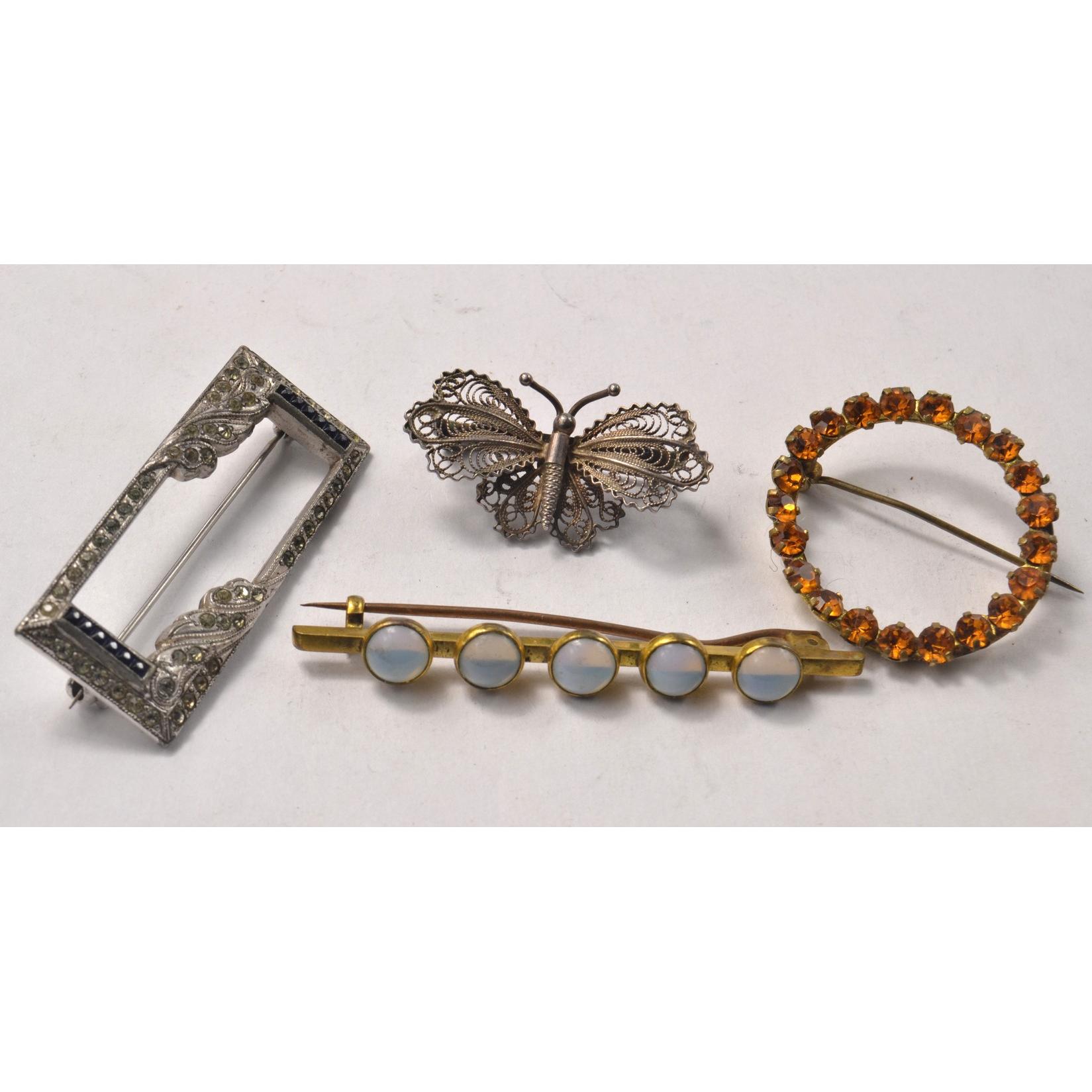Vintage lot to include 800 stamped silver butterfly brooch 3cm D, rectangular Art Deco inspired brooch 4.5cm legth, a moonstone set brooch 6cm length and one other