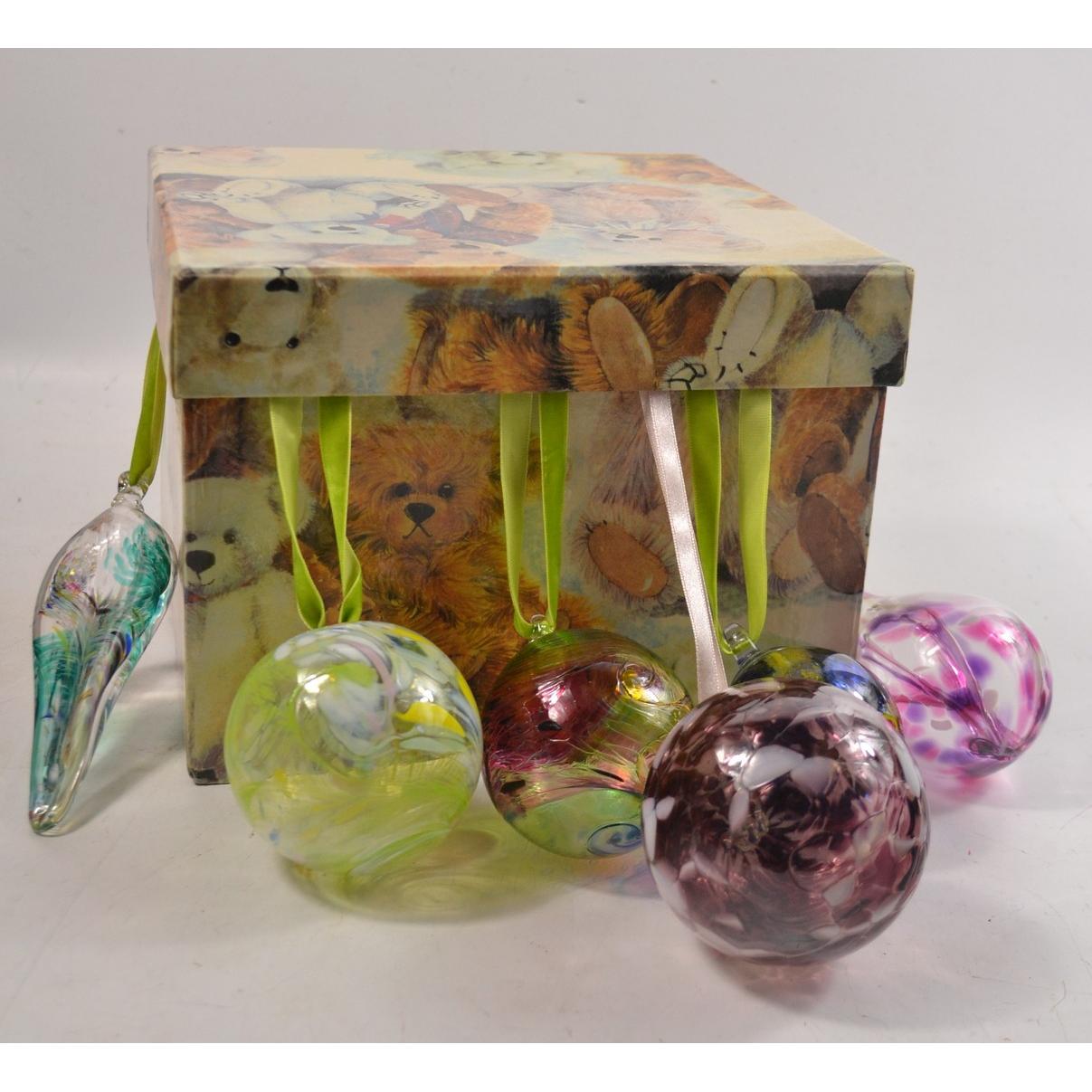 Box containg 6 Selkirk Glass Frienship balls, all differant colours and shapes.