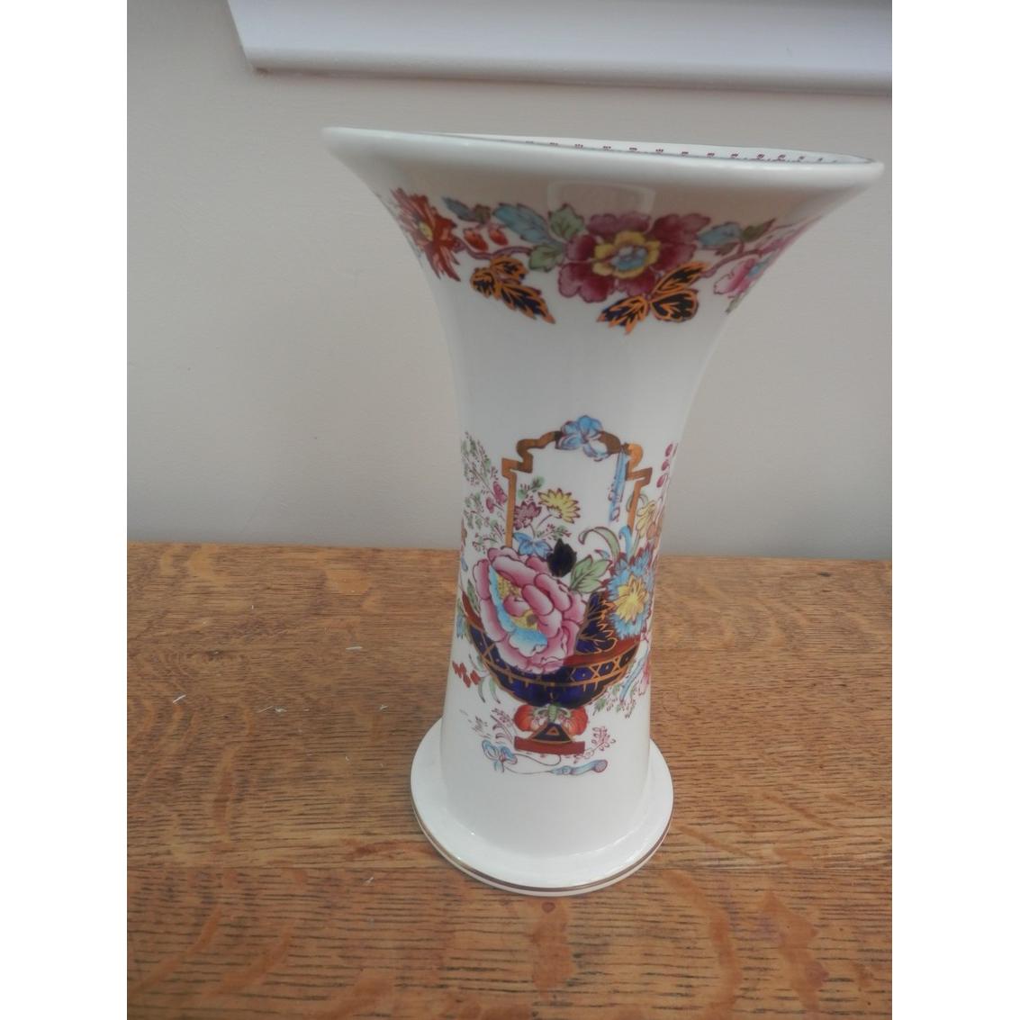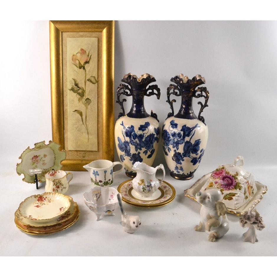 Quality Lot! Mixed box to include blue and white double handled vases, NAO style dog, port merion cup etc