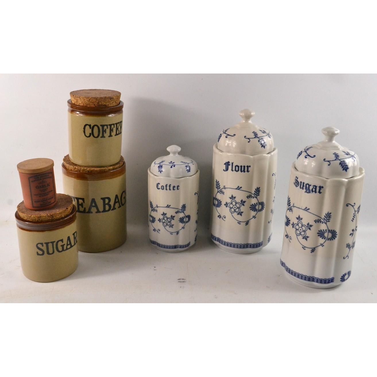 Two sets of storage jars to include blue and white and stoneware style with cork lids, also a garlic canister