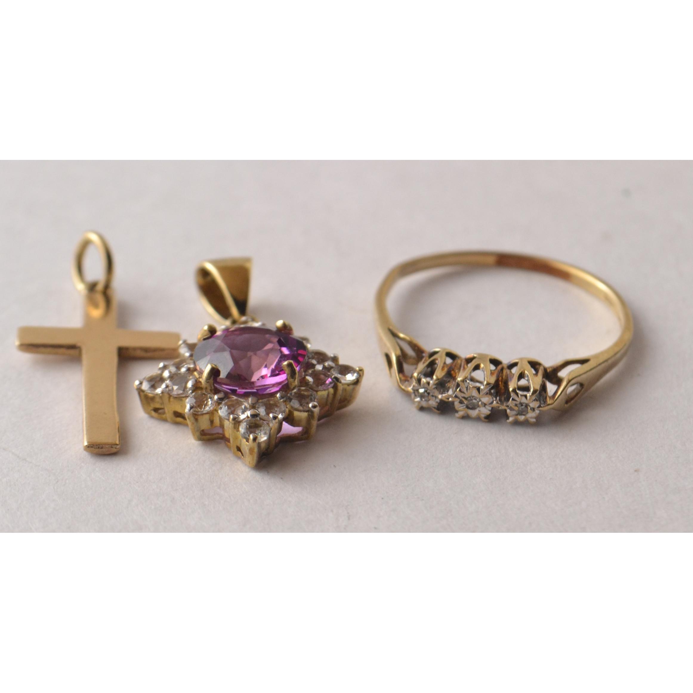 Vintage 375 stamed gold ring with 3 white stones ring size O gross weight 1.20g, and also a 375 stamped gold pendant with centre pink style amythest gross weight 2.20g, also a small gold 375 stamped cross .85g gross