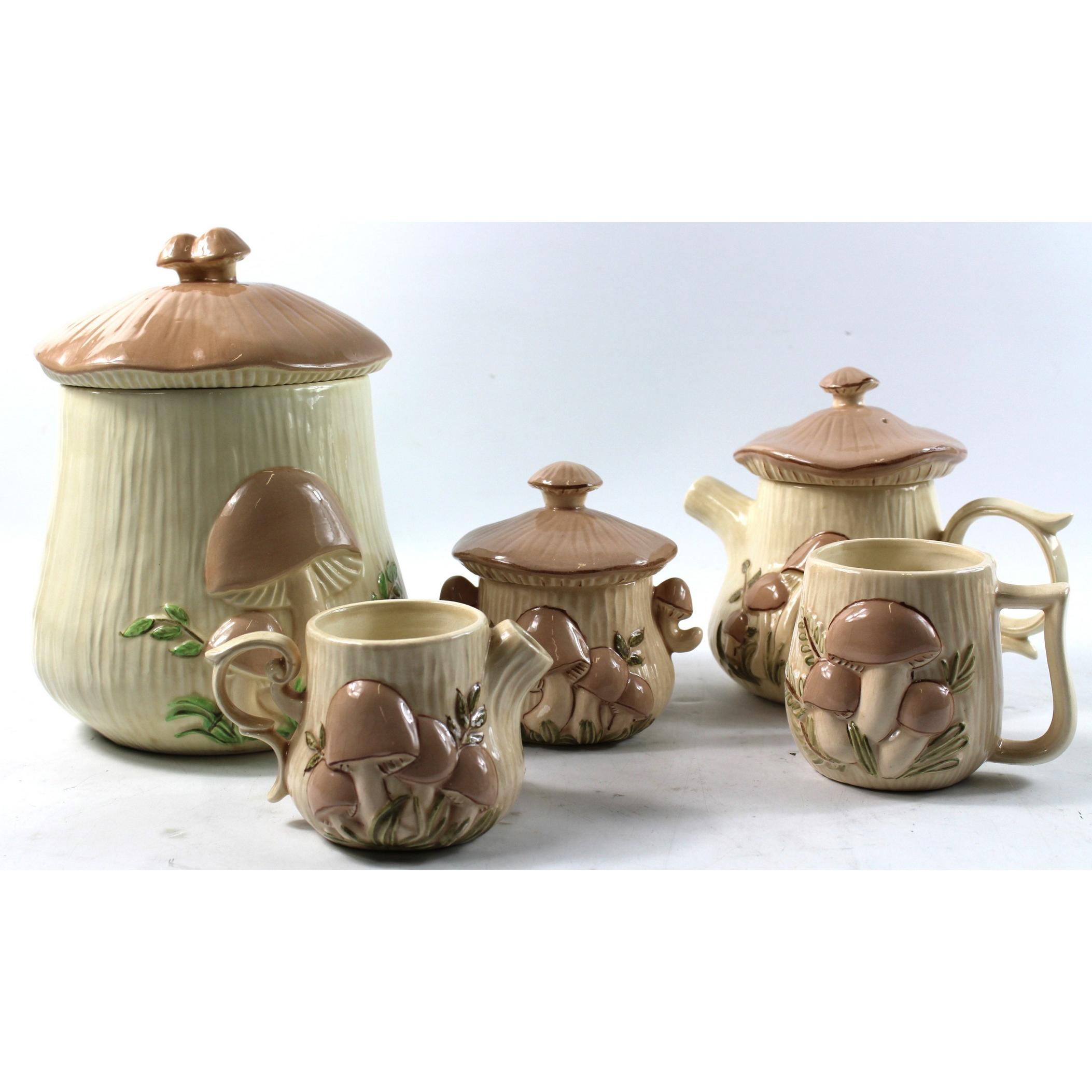 UNUSUAL 1970's vintage ARNERS 'Mushroom tea set to include 2 mugs, teapot, sugar and cream and a biscuit barrel