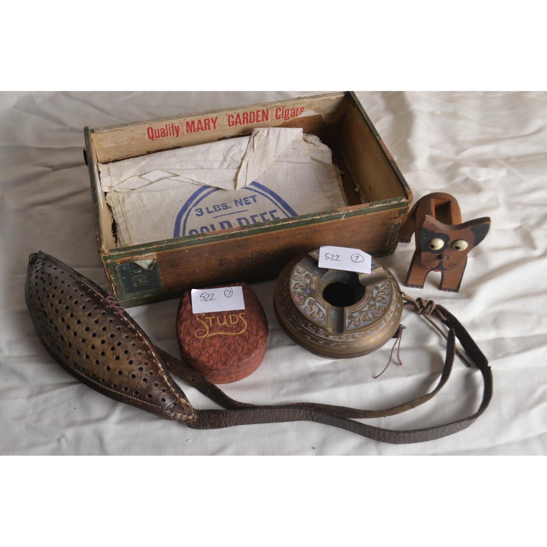 An Old Cigar box 'MARY GARDEN CIGARS' with odd bits to include a vintage leather waist pin cushion,