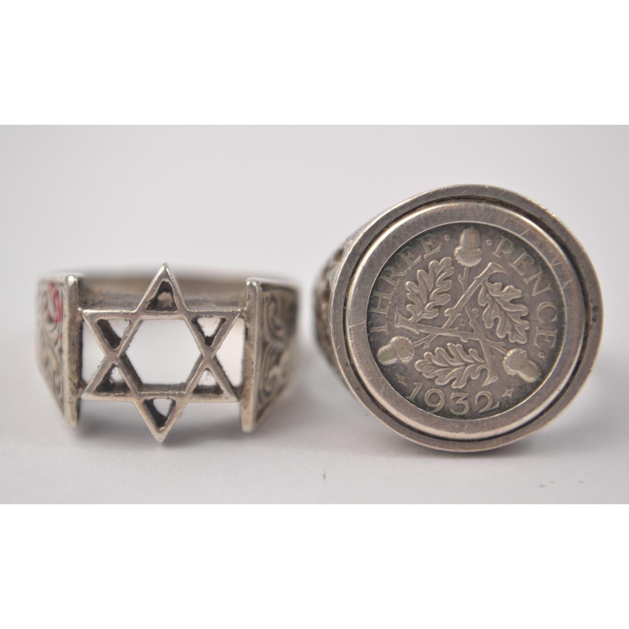 925 silver dress with purple amethyst stone ring size Q, gross weight 2.25g, another silver 925 bstamped dress ring with white stone setting size M gross weight 3.42g, and a silver sterling scottish thistle brooch with amber style stone 3.5cm Length gross weight 3.70g