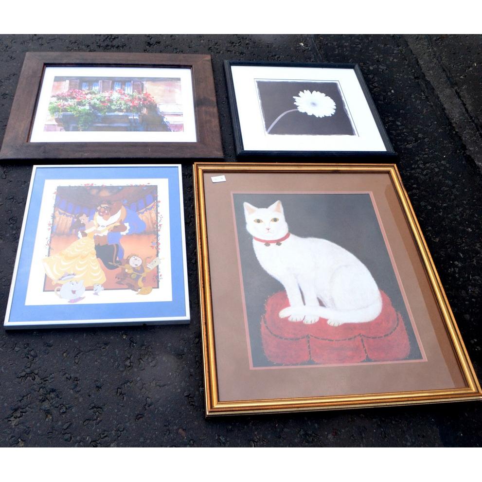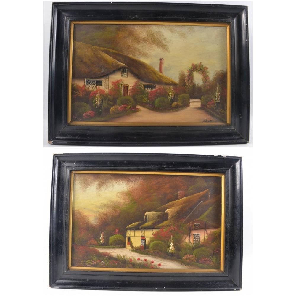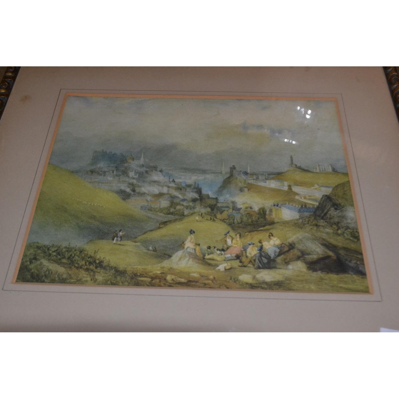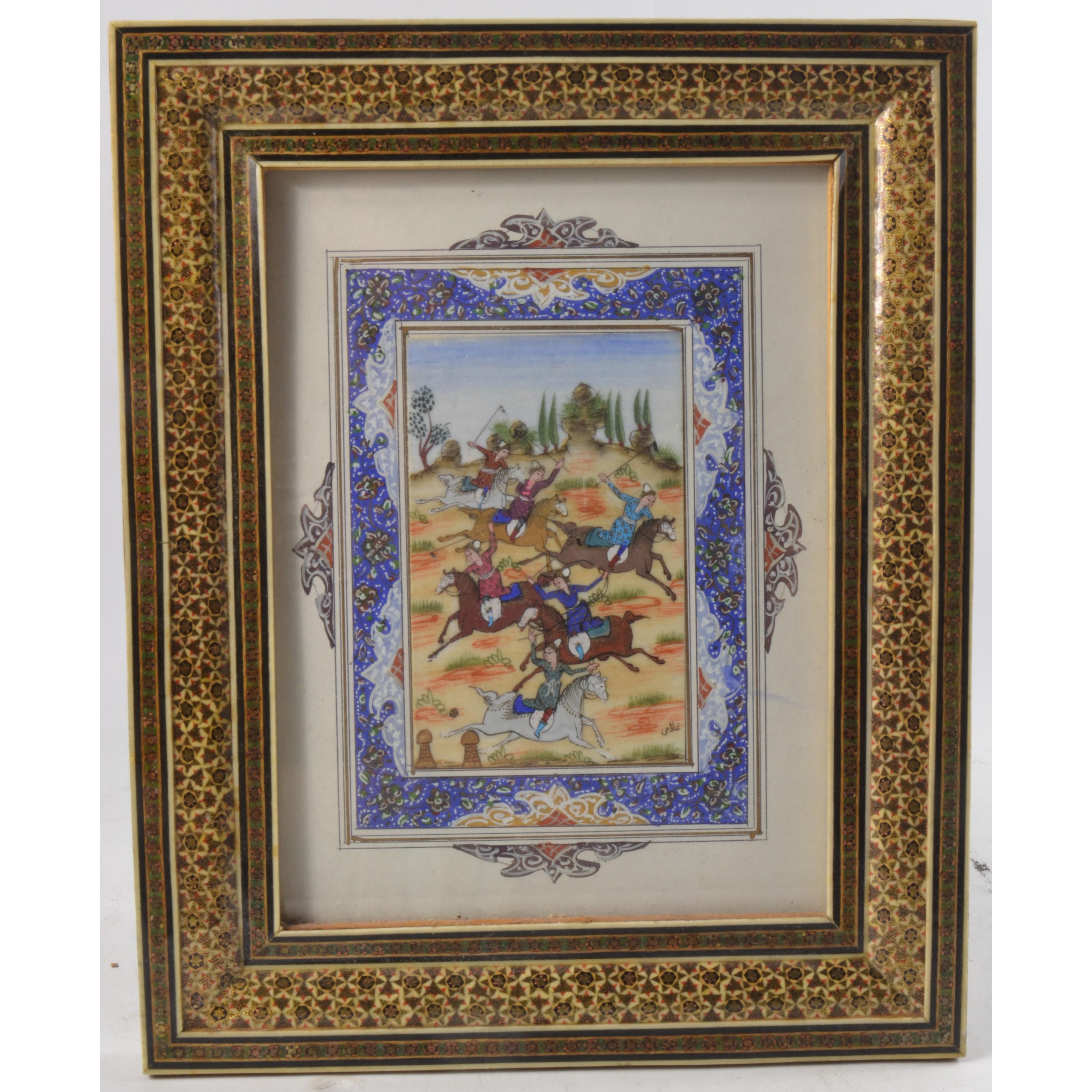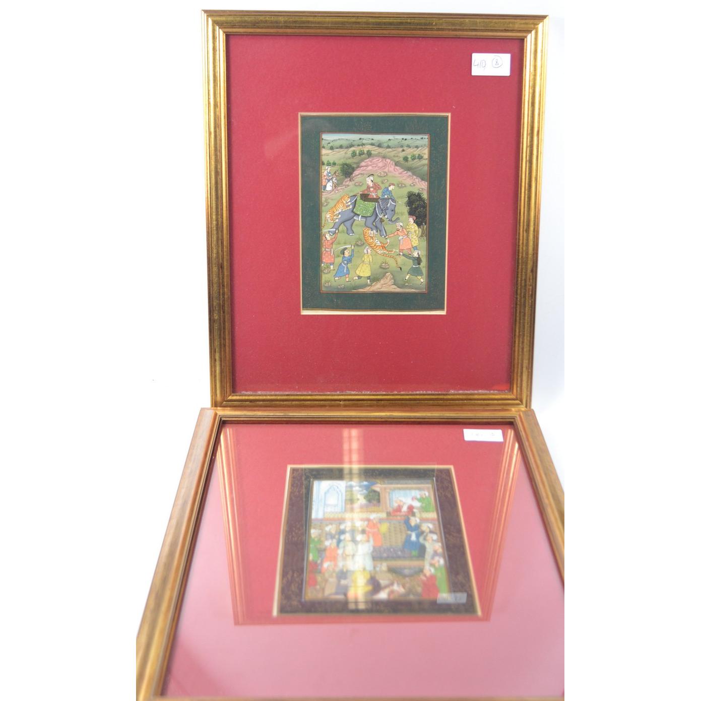 Two handpainted Indian panels depicting Bengali tigers and court scene on red mounted card