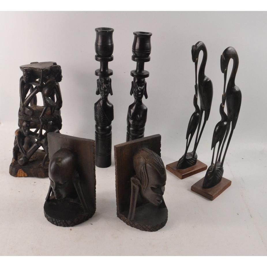 East African tribal art items to include tree of life 25cm H bookends and 2 candle sticks male and female form