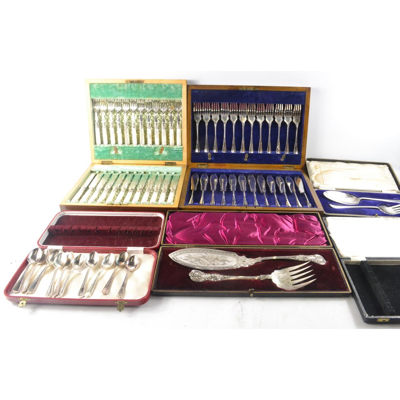 Various vintage canteens of cutlery, serving spoons and forks and teaspoons and one small empty canteen x 6